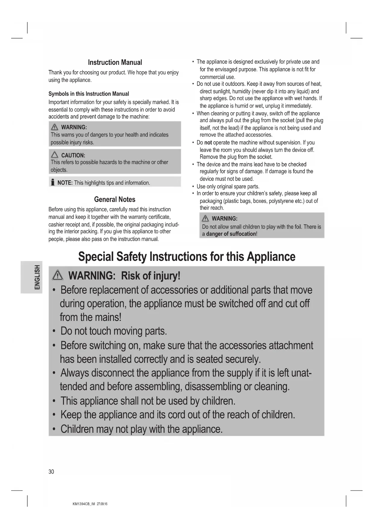 Do not allow small children to play with the foil. There is a danger of suffocation! Special Safety Instructions for this Appliance