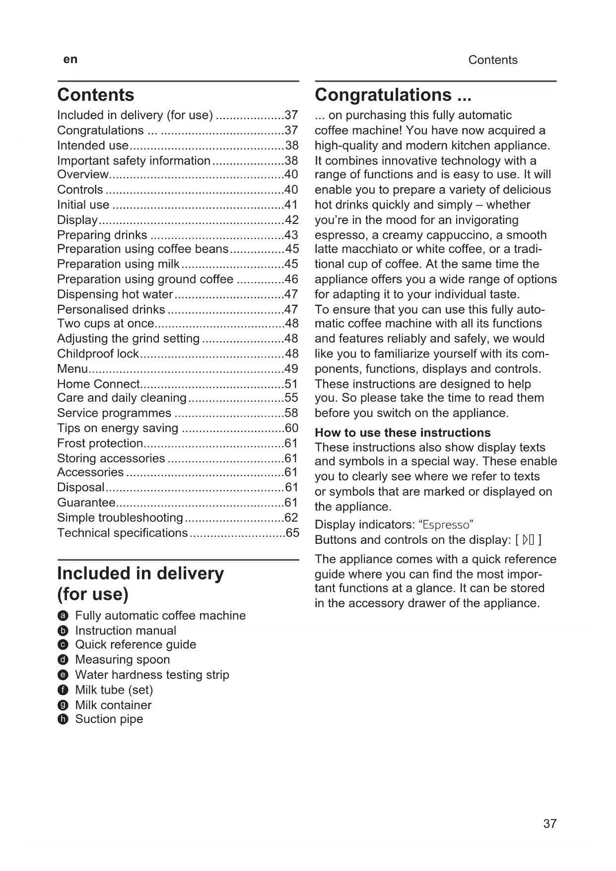 - Contents Included in delivery (for use) a Fully automatic coffee machine b Instruction manual c Quick reference guide d Measuring spoon e Water hardness testing strip f Milk tube (set) g Milk container h Suction pipe Contents Included in delivery (for use) p. 37