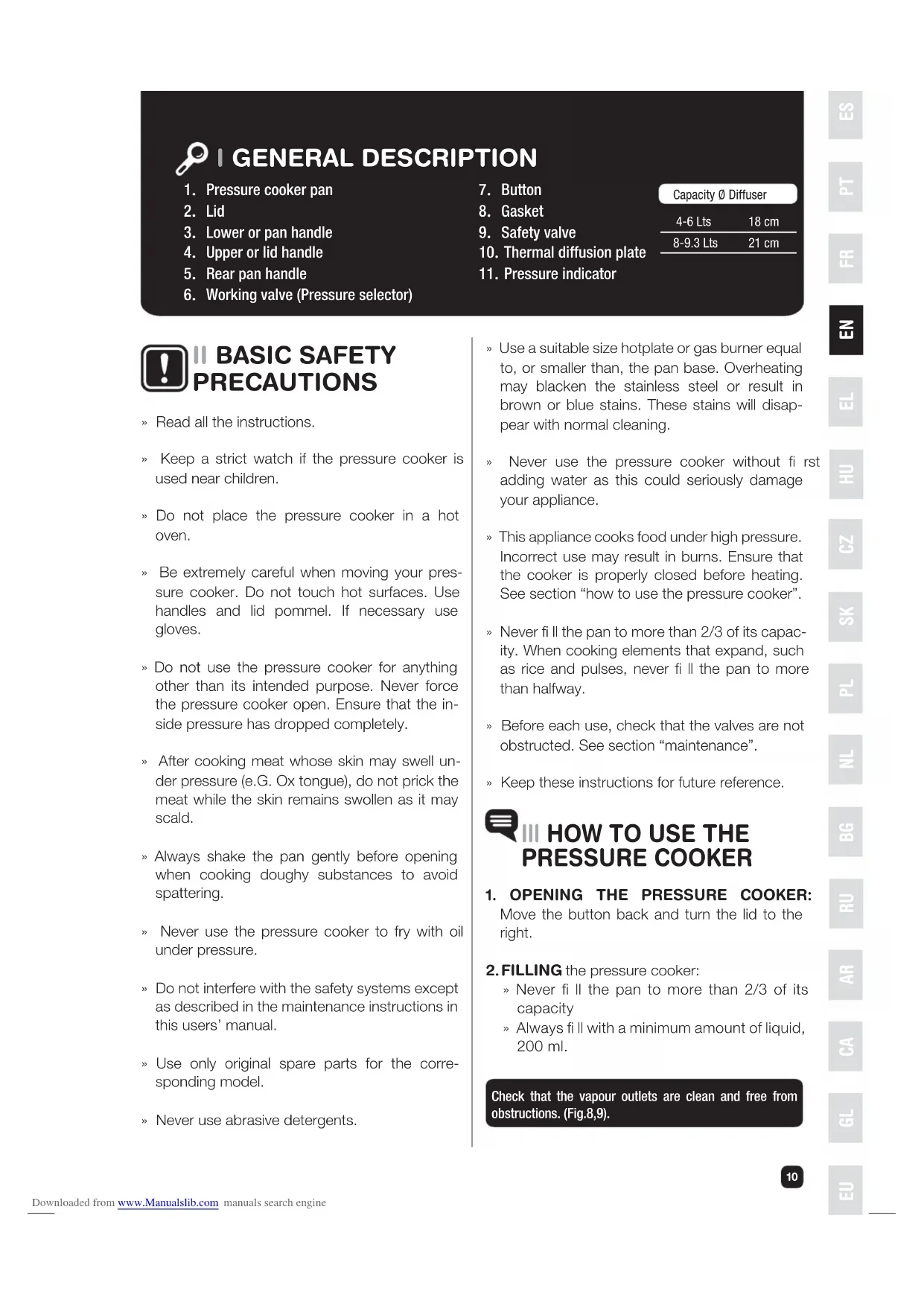 » Never fi ll the pan to more than 2/3 of its capacity » Always fi ll with a minimum amount of liquid, 200 ml. Check that the vapour outlets are clean and free from obstructions. (Fig.8,9).Capacity Ø Diffuser4-6 Lts8-9.3 Lts18 cm21 cm » Read all the instructions. » Keep a strict watch if the pressure cooker is used near children. » Do not place the pressure cooker in a hot oven. » Be extremely careful when moving your pres- sure cooker. Do not touch hot surfaces. Use handles and lid pommel. If necessary use gloves. » Do not use the pressure cooker for anything other than its intended purpose. Never force the pressure cooker open. Ensure that the in- side pressure has dropped completely. » After cooking meat whose skin may swell un- der pressure (e.G. Ox tongue), do not prick the meat while the skin remains swollen as it may scald. » Always shake the pan gently before opening when cooking doughy substances to avoid spattering. » Never use the pressure cooker to fry with oil under pressure. » Do not interfere with the safety systems except as described in the maintenance instructions in this users’ manual. » Use only original spare parts for the corre- sponding model. » Never use abrasive detergents.