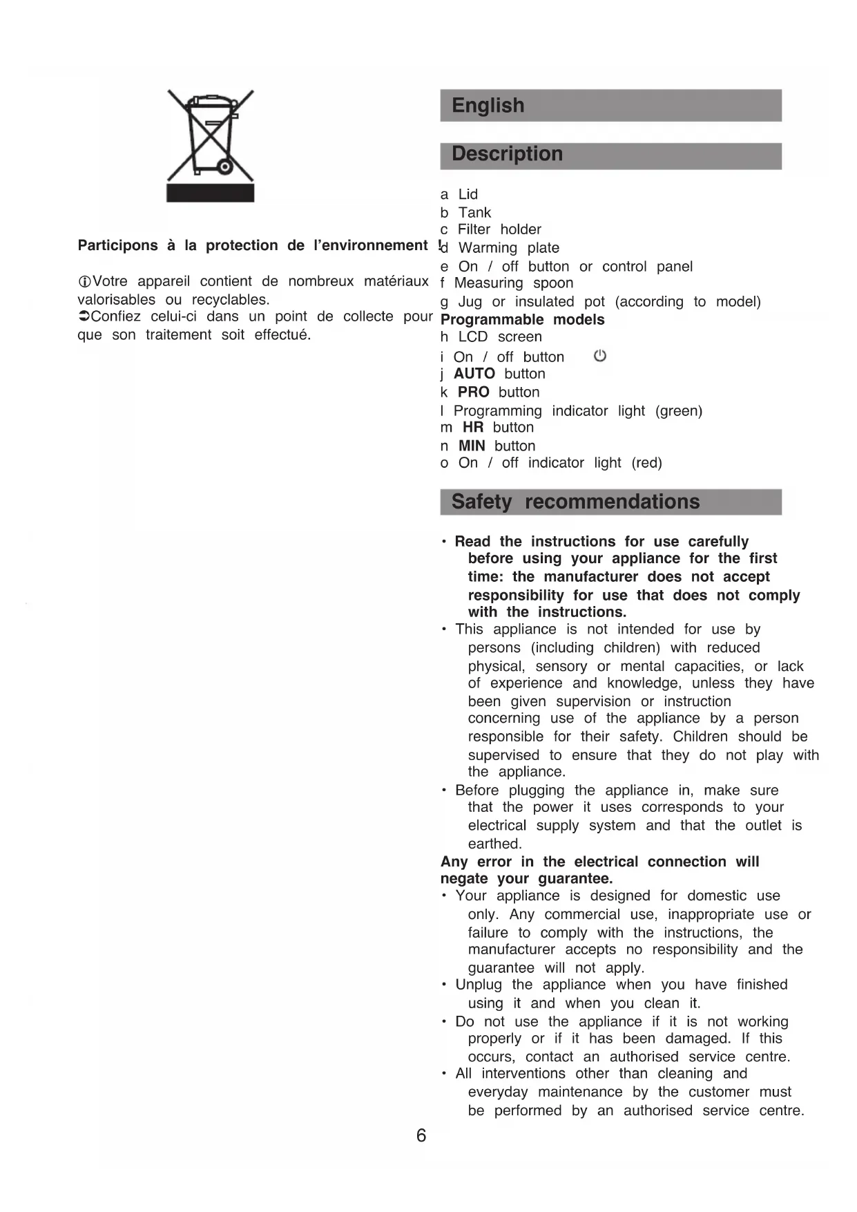 - Rinse the coffee maker by running 1 litre of water through it 2 or 3 times. The guarantee does not cover coffee makers that do not work properly or do not work at all because they have not been descaled. Accessories Insulated pot Glass jug Troubleshooting - Check: