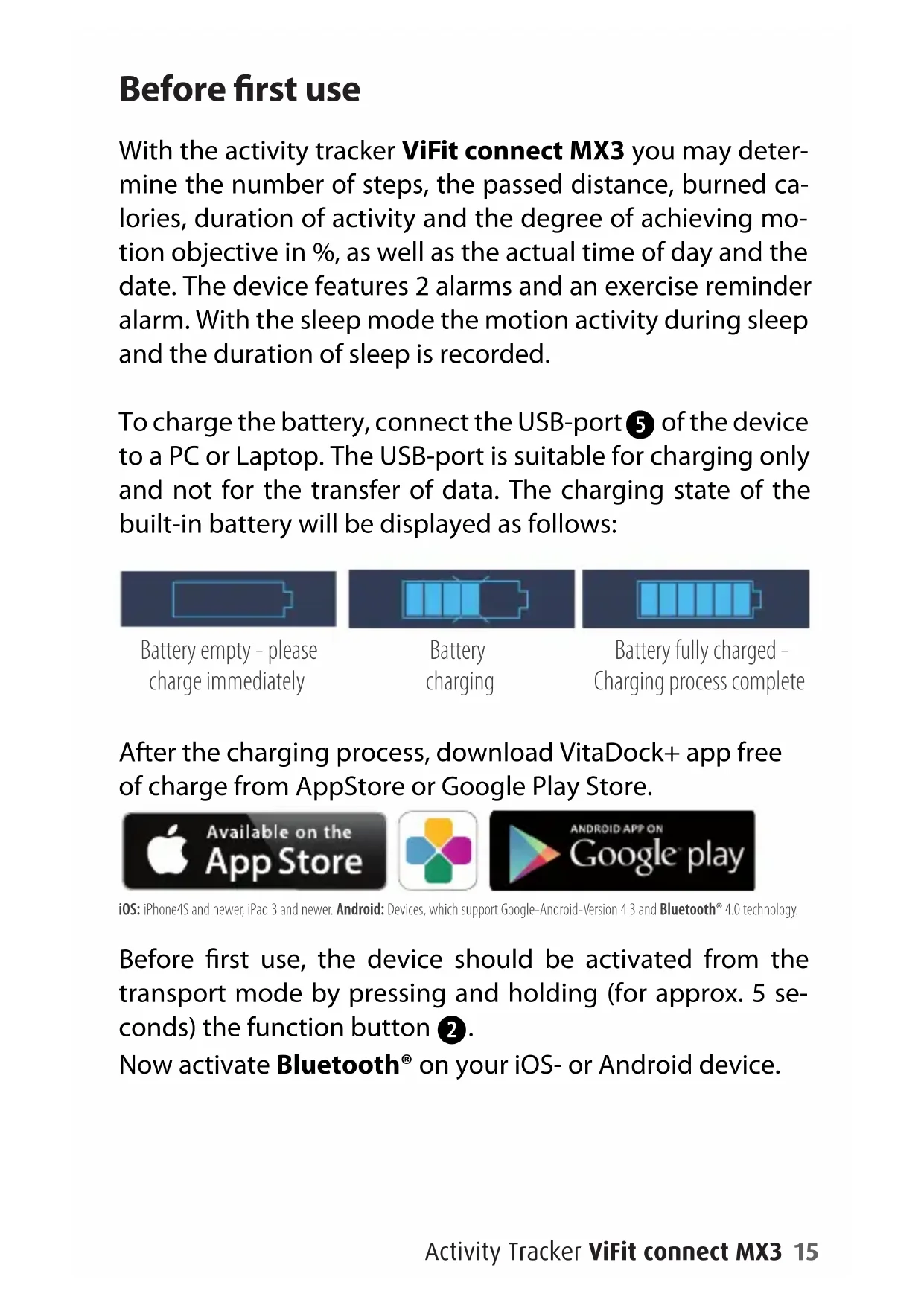 of the device to a PC or Laptop. The USB-port is suitable for charging only and not for the transfer of data. The charging state of the built-in battery will be displayed as follows: Battery empty - please Battery Battery fully charged - charge immediately charging Charging process complete After the charging process, download VitaDock+ app free of charge from AppStore or Google Play Store. iOS: iPhone4S and newer, iPad 3 and newer. Android: Devices, which support Google-Android-Version 4.3 and Bluetooth® 4.0 technology. Before rst use, the device should be activated from the transport mode by pressing and holding (for approx. 5 se- conds) the function button