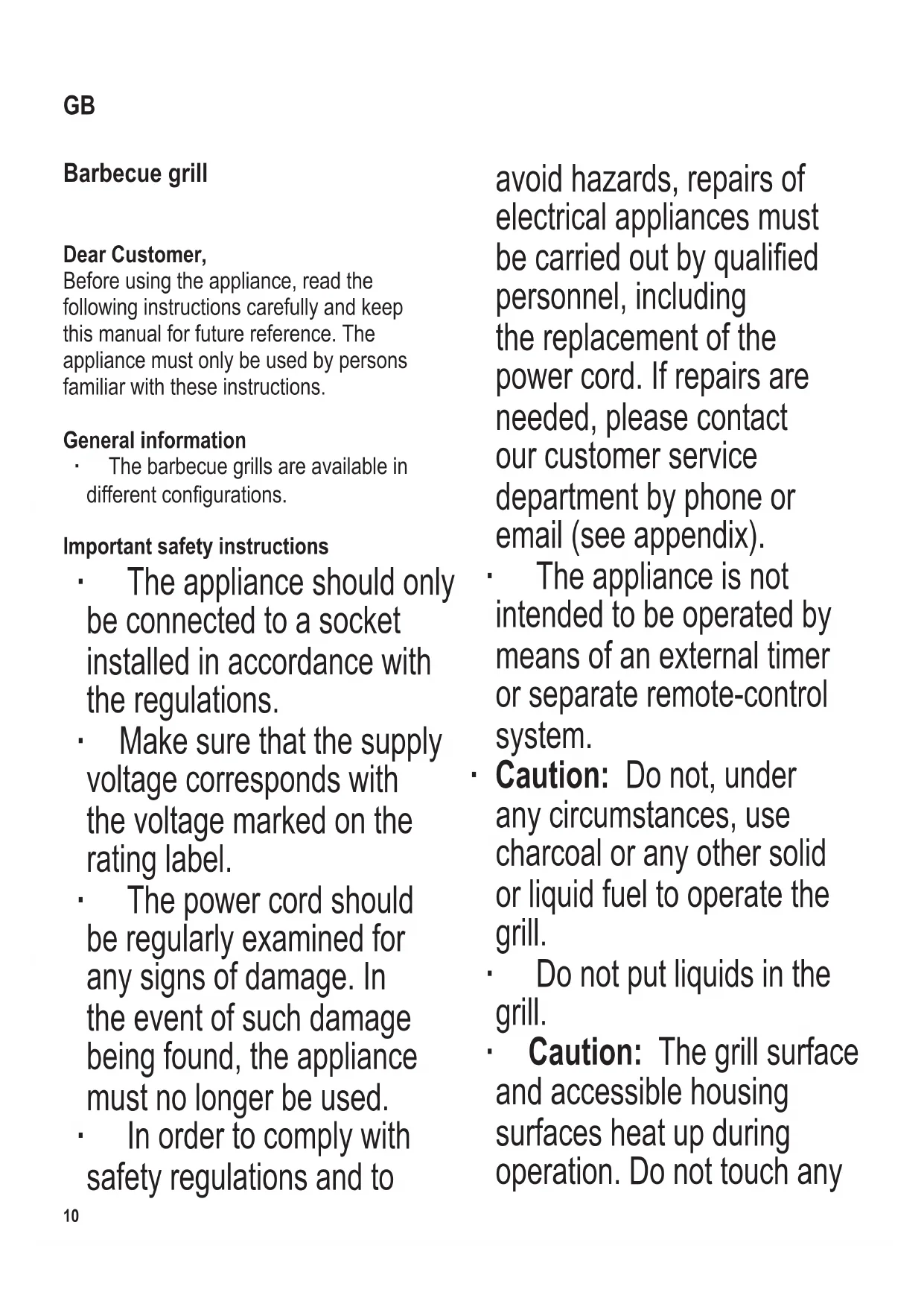 part of the appliance except the grip recesses during and after operation. ∙ Before cleaning, disconnect the appliance from the mains and let the grill cool down. ∙ To avoid the risk of electric shock, the junction box with power cord must not cleaned with or immersed in liquid. ∙ Clean the grill plate with hot soapy water; dry thoroughly afterwards. Ensure that the grill plate is absolutely dry, especially on the side with the junction box, before the grill is used again. ∙ For detailed information on cleaning the appliance, please refer to the section Cleaning and care. ∙ This appliance is intended for domestic or similar applications, such as - in staff kitchens in shops, ofces and other similar working environments, - in agricultural working environments, - by customers in hotels, motels etc. and similar accommodation, - in bed-and breakfast type environments. ∙ This appliance may be used by children (at least 8 years of age) and by persons with reduced physical, sensory or mental capabilities, or lacking experience and knowledge, provided they have been given supervision or instruction concerning the use of the appliance and fully understand all dangers and safety precautions involved. ∙ Children must not be12 104 x 142 mm permitted to play with the appliance. ∙ Children must not be permitted to carry out any cleaning or maintenance work on the appliance unless they are supervised and at least 8 years of age. ∙ The appliance and its power cord must be kept well away from children under 8 at all times. ∙ Caution: Keep any packaging materials well away from children – these are a potential source of danger, e.g. of suffocation. ∙ Caution: Do not, under any circumstances, cover the grill plate completely with aluminium foil, barbecue dishes or other items, as the resulting build-up of heat could cause irreparable damage to the grill. ∙ Before the appliance is used, the main body as well as any attachment tted should be checked thoroughly for any defects. Should the appliance, for instance, have been dropped onto a hard surface, it must no longer be used: even invisible damage may have adverse effects on the operational safety of the appliance. In this case, please contact our customer service. ∙ During operation, the barbecue grill must be placed on a level, heat-resistant surface, impervious to splashes and stains. When grilling food with a high fat or moisture content, splashes are not always avoidable. ∙ The power cord should be routed in such a way that no one is likely to trip over it. ∙ Do not position the grill next to a wall or corner, and ensure that no inammable materials are stored near it. ∙ Before the grill is used, always check that the fat collection tray is correctly tted in the barbecue grill. ∙ The barbecue grill must be supervised at all times during operation. ∙ Do not allow the power cord to touch any hot parts of the appliance. ∙ Always remove the plug from the wall socket - after use, - in case of any malfunction, and - during cleaning. ∙ When removing the plug from the wall socket, never pull on the power cord; always grip the plug itself. ∙ The use of an extension-lead reel causes a loss of power, possibly combined with a subsequent heat build- up in the cable. It is therefore necessary to unwind the cable completely from the reel. ∙ Caution: Do not move the grill when it is in use. Before carrying, transporting or storing the grill, ensure that is has sufciently cooled down. ∙ No responsibility is accepted if damage results from improper use, or if these instructions are not complied with.104 x 142 mm