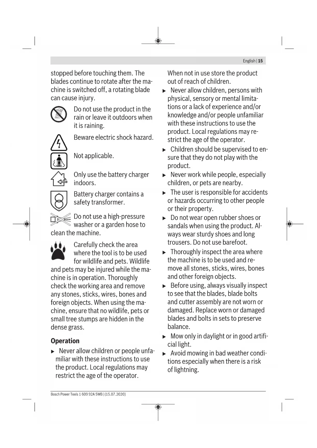 to the product when operat- ing. Caution: Do not touch rotat- ing blades. Sharp blade(s). Beware of severing toes or fingers. Switch off and remove isol- ator switch before adjusting, cleaning and before leaving the product unattended for any period. Not applicable. Wait until all machine com- ponents have completely 1 609 92A 5WB | (15.07.2020) Bosch Power ToolsEnglish | 15 stopped before touching them. The blades continue to rotate after the ma- chine is switched off, a rotating blade can cause injury. Do not use the product in the rain or leave it outdoors when it is raining. Beware electric shock hazard. Not applicable. Only use the battery charger indoors. Battery charger contains a safety transformer. Do not use a high-pressure washer or a garden hose to clean the machine. Carefully check the area where the tool is to be used for wildlife and pets. Wildlife and pets may be injured while the ma- chine is in operation. Thoroughly check the working area and remove any stones, sticks, wires, bones and foreign objects. When using the ma- chine, ensure that no wildlife, pets or small tree stumps are hidden in the dense grass. Operation u Never allow children or people unfa- miliar with these instructions to use the product. Local regulations may restrict the age of the operator. When not in use store the product out of reach of children. u Never allow children, persons with physical, sensory or mental limita- tions or a lack of experience and/or knowledge and/or people unfamiliar with these instructions to use the product. Local regulations may re- strict the age of the operator. u Children should be supervised to en- sure that they do not play with the product. u Never work while people, especially children, or pets are nearby. u The user is responsible for accidents or hazards occurring to other people or their property. u Do not wear open rubber shoes or sandals when using the product. Al- ways wear sturdy shoes and long trousers. Do not use barefoot. u Thoroughly inspect the area where the machine is to be used and re- move all stones, sticks, wires, bones and other foreign objects. u Before using, always visually inspect to see that the blades, blade bolts and cutter assembly are not worn or damaged. Replace worn or damaged blades and bolts in sets to preserve balance. u Mow only in daylight or in good artifi- cial light. u Avoid mowing in bad weather condi- tions especially when there is a risk of lightning. Bosch Power Tools 1 609 92A 5WB | (15.07.2020)16 | English u Avoid operating the machine in wet grass, where feasible. u Walk, never run. u Never operate the machine with de- fective guards or shields, or without safety devices, for example deflect- ors and/or grass catchers in place. u We would advise you to wear ear protection for your own conveni- ence. u Never operate the product when you are tired, ill or under the influence of alcohol, drugs or medicine. u Working on banks can be dangerous: − Do not mow on excessively steep slopes. − Always be sure of your footing on slopes or wet grass. − Mow across the face of slopes never up and down. − Exercise extreme caution when changing direction on slopes. u Use extreme caution when stepping back or pulling the machine towards you. u Never mow by pulling the mower to- wards you. u Wait until the blades stop if the ma- chine has to be tilted for transporta- tion when crossing surfaces other than grass and when transporting the machine to and from the area to be mowed. u Do not tilt the machine when starting or switching on the motor. u Switch on the motor according to the instructions with feet well away from rotating parts. u Do not put hands or feet near or un- der rotating parts. u Always stand clear of the discharge zone when operating the machine. u Never pick up or carry the machine while the motor is running. u When storing, make sure that all 4 wheels of the garden tool stand on the ground/floor. u Only lift the garden tool with the car- rying handle. Use the carrying handle with care. u Do not modify the machine. Unau- thorized modifications can impair the safety of your machine, lead to increased noise and vibrations, and poor performance. Leaf Collect The leaf collect blade has been de- signed to allow you to pick up autumn leaves from your lawn. In order for this functionality to work within optimal parameters, please note the following: – Only collect leaves with the ma- chine set at maximum cutting height. – Collect leaves from your lawn only. – Before collecting leaves inspect the area where the machine is to be used and keep people, pets, glass structures and cars away from use. 1 609 92A 5WB | (15.07.2020) Bosch Power ToolsEnglish | 17 Remove the isolator switch: – Whenever you leave the machine. – Before clearing a blockage. – Before checking, cleaning or work- ing on the machine. – After striking a foreign object. In- spect the machine for damage and change the blade as necessary. – If the machine starts to vibrate ab- normally (check immediately). Maintenance u Always wear gardening gloves when handling or working near the sharp blades. u Keep all nuts, bolts and screws tight to ensure safe working with the product. u Check the grass bag frequently for wear or deterioration. u Check the grass catcher frequently for wear or deterioration. u Inspect the product and replace worn or damaged parts for safety. u Ensure replacement cutting means of the right type are used. u Ensure replacement parts fitted are Bosch-approved. u Before storing, make sure that the product is clean and free of residue. If necessary, clean with a soft dry brush. Safety Instructions and Recommendations for Optimal Handling of the Battery u Ensure the product is switched off and the isolator key is in the off position before the inserting the battery. Inserting the battery into a product that has the switch on can cause accidents. u Use only Bosch batteries intended specifically for this product. Use of any other bat