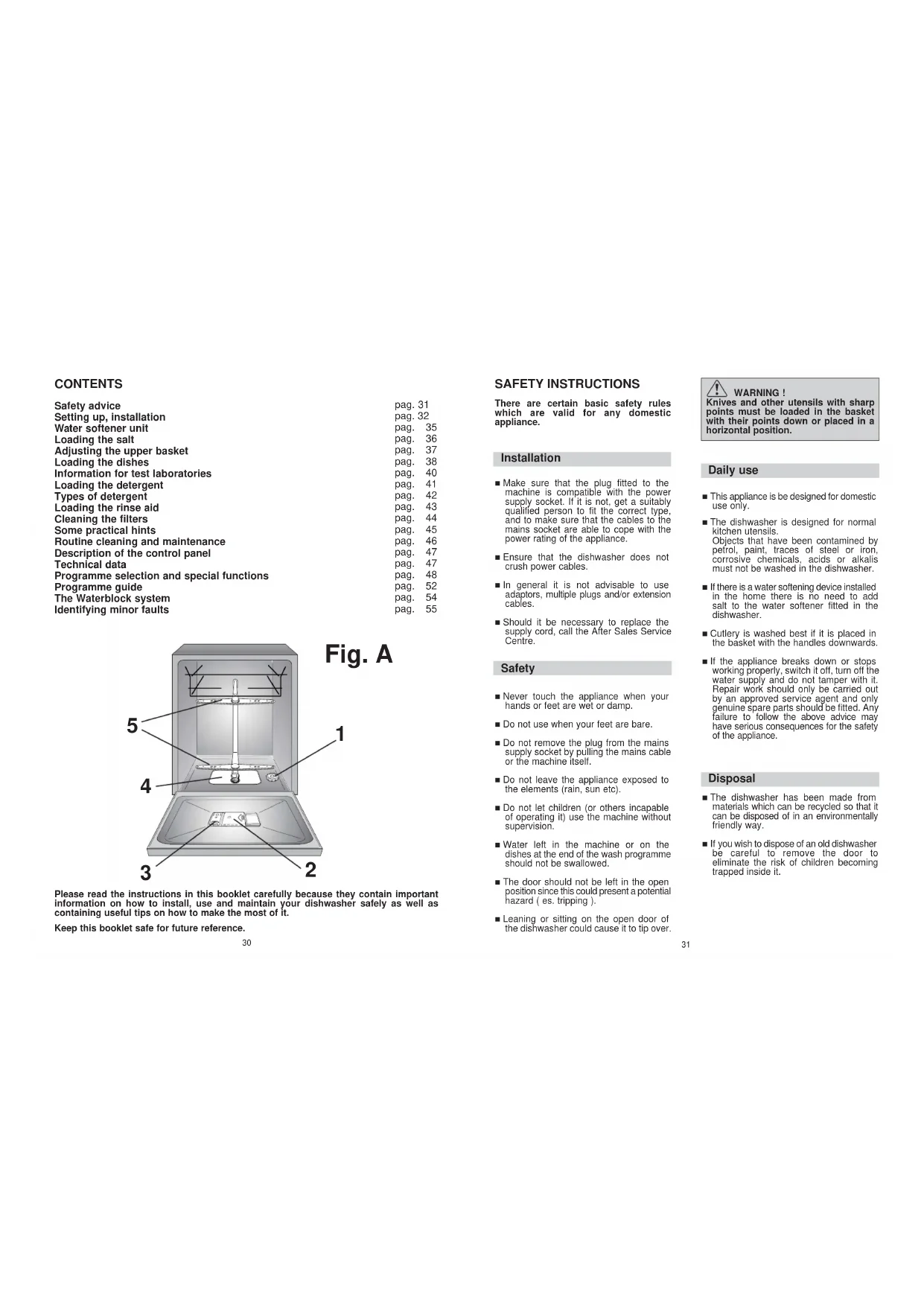 The waterblock system has been designed to improve the safety of your appliance, particularly when the machine is left unattended. The waterblock system actually prevents flooding which might be caused by a machine malfunction or as a result of a fracture on the pipes. How does waterblock work The sump located in the base of the appliance collects any possible water leakage and operates a sensor which subsequently activates a valve placed under the water tap and stops any water from the supply even with the tap fully opened. If the box containing the electrical parts is damaged, remove the plug from the socket immediately. To ensure perfect operation of the safety system, box “A” with the hose, should be connected to the tap as shown in figure “1”. The inlet hose should not be cut, as it contains parts under load. If the hose is not long enough for correct connection, it must be replaced with a longer one. The hose can be obtained from your Service Agent. This dishwasher is also equipped with an anti-overflow safety device which, if water exceeds normal levels due to malfunctions, automatically blocks water flow and/or drains excess quantities.56 N.B.: Should any of the situations occur and should the machine give a bad wash performance, it is necessary to remove the deposits from the dishes by hand since the final drying cycle hardens the deposits which a second wash in the machine would not be able to remove. If the malfunction continues contact a Service Centre quoting the serial number of the dishwasher. This is found on the plaque on the inside of the dishwasher door at the top or on the guarantee. This information will make it possible to take more effective action more quickly. The manufacturers decline any responsibility for any printing mistakes in this instruction booklet. They also reserve the right to modify their own appliances as necessary without altering the essential characteristics.