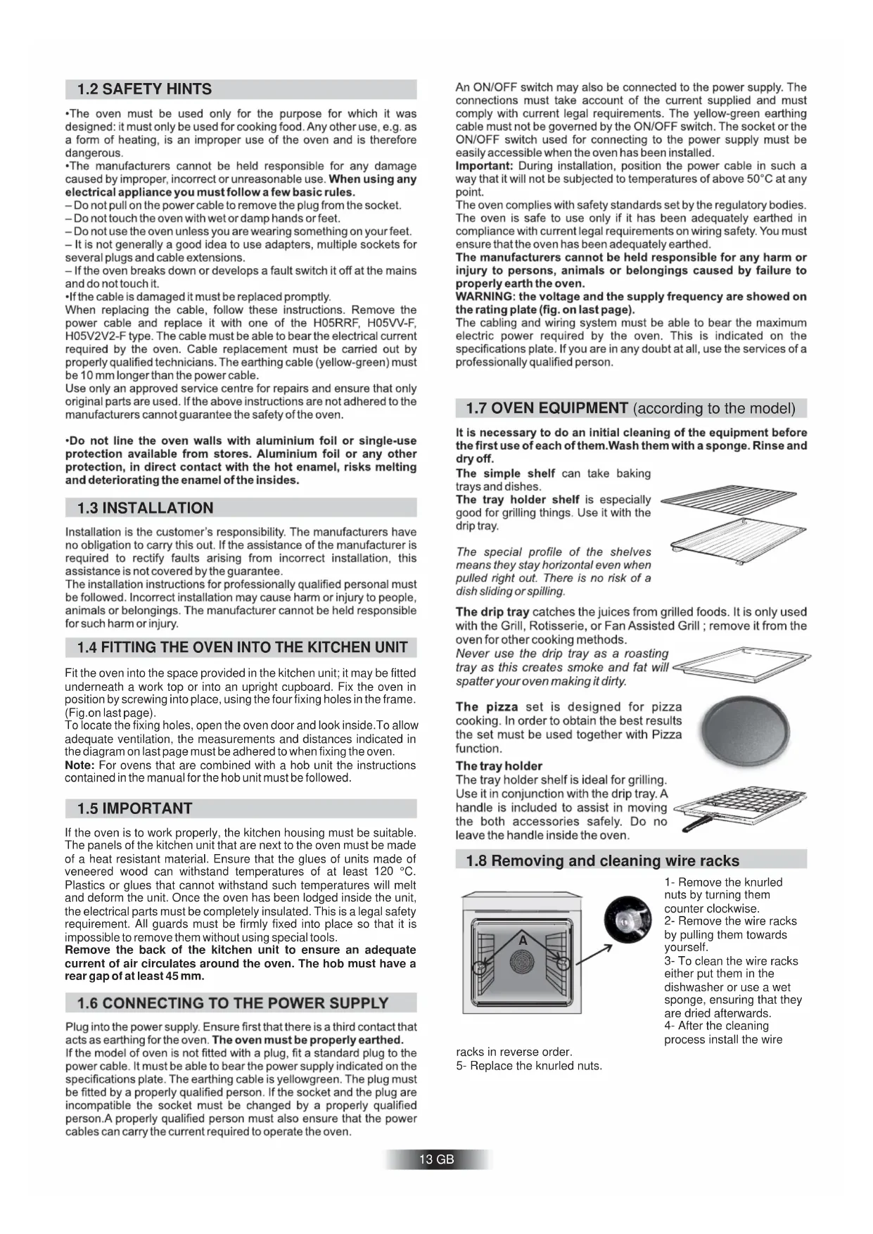 1.7 OVEN EQUIPMENT (according to the model)