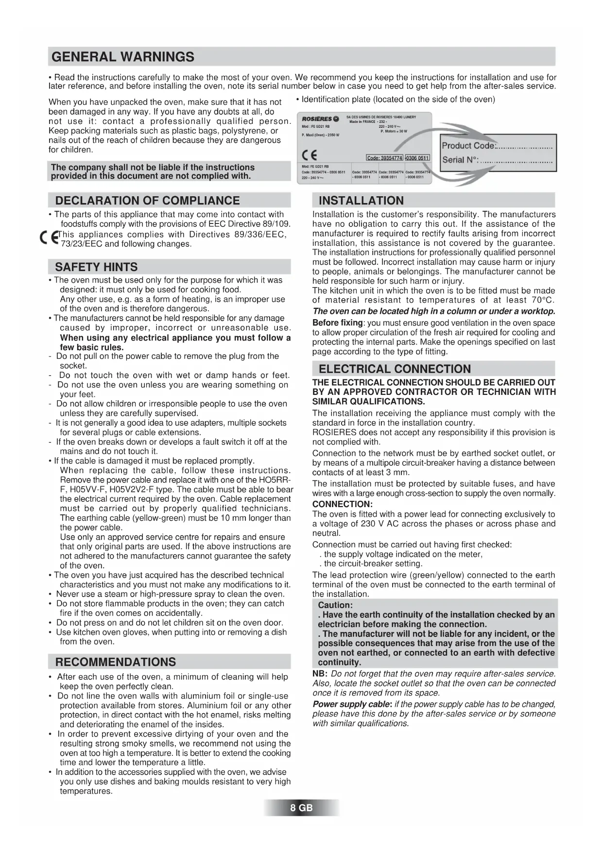 - Identification plate (located on the side of the oven) The company shall not be liable if the instructions provided in this document are not complied with. SA DES USINES DE ROSIERES 18400 LUNERYMade in FRANCE - 232 -220 - 240 V P. Motors = 30 WMod : FE GD21 RBP. Maxi (Oven) - 2350 WCode: 39354774 -0306 0511Mod: FE GD21 RBCode: 39354774 - 0306 0511220 - 240 VCode: 39354774- 0306 0511Code: 39354774- 0306 0511Code: 39354774- 0306 0511 When you have unpacked the oven, make sure that it has not been damaged in any way. If you have any doubts at all, do not use it: contact a professionally qualified person. Keep packing materials such as plastic bags, polystyrene, or nails out of the reach of children because they are dangerous for children. SAFETY HINTS