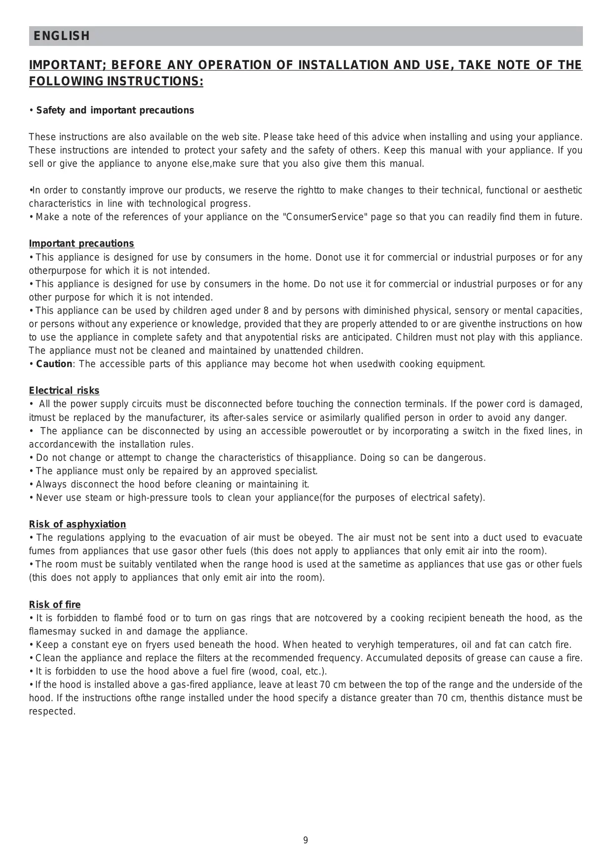 - It is forbidden to flambé food or to turn on gas rings that are notcovered by a cooking recipient beneath the hood, as the flamesmay sucked in and damage the appliance.