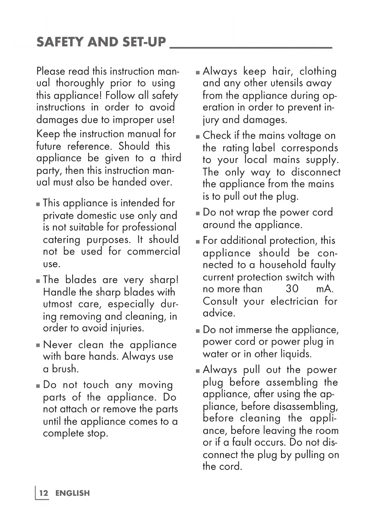 Always pull out the power plug before assembling the appliance, after using the ap- pliance, before disassembling, before cleaning the appli- ance, before leaving the room or if a fault occurs. Do not dis- connect the plug by pulling on the cord.ENGLISH