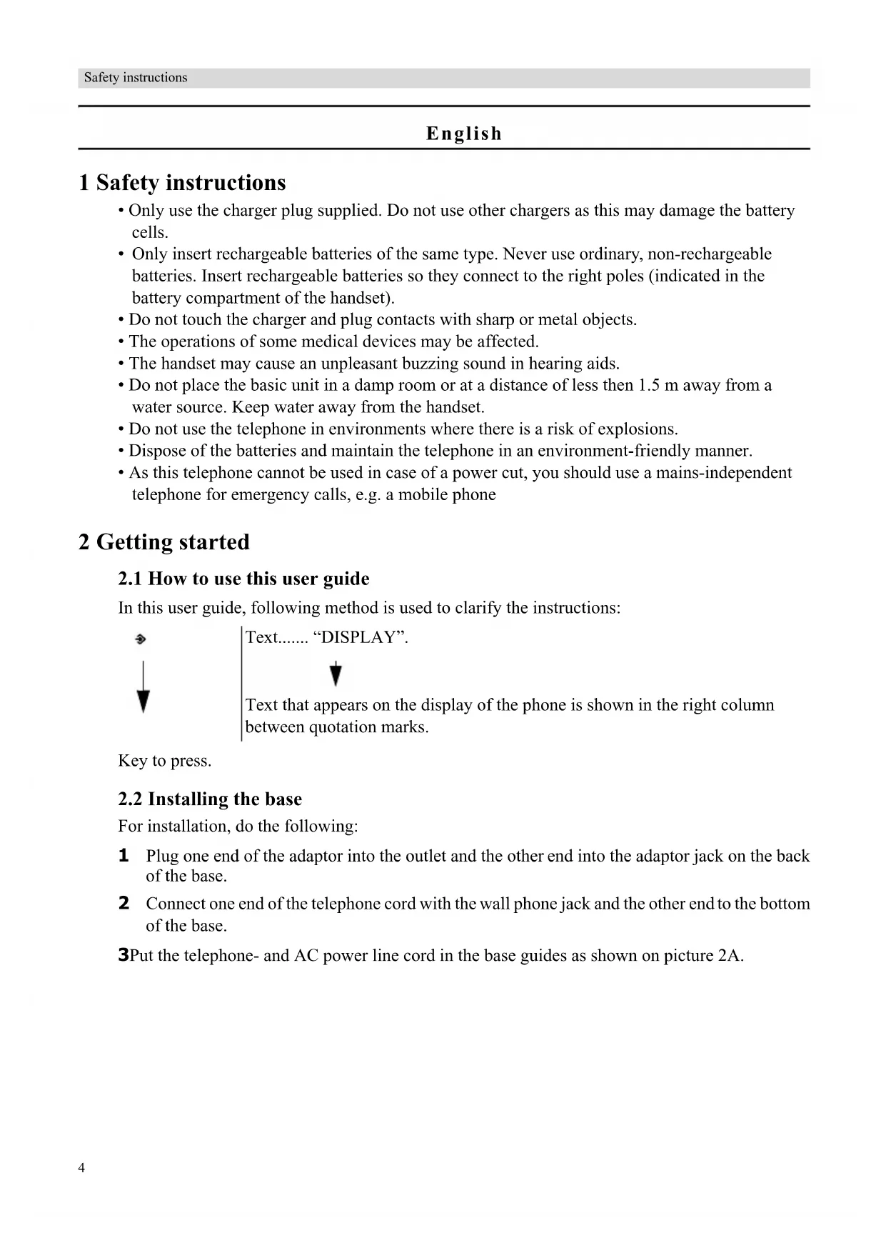 For installation, do the following: 1 Plug one end of the adaptor into the outlet and the other end into the adaptor jack on the back of the base. 2 Connect one end of the telephone cord with the wall phone jack and the other end to the bottom of the base. 3 Put the telephone- and AC power line cord in the base guides as shown on picture 2A. Text....... “DISPLAY”. Text that appears on the display of the phone is shown in the right column between quotation marks.English