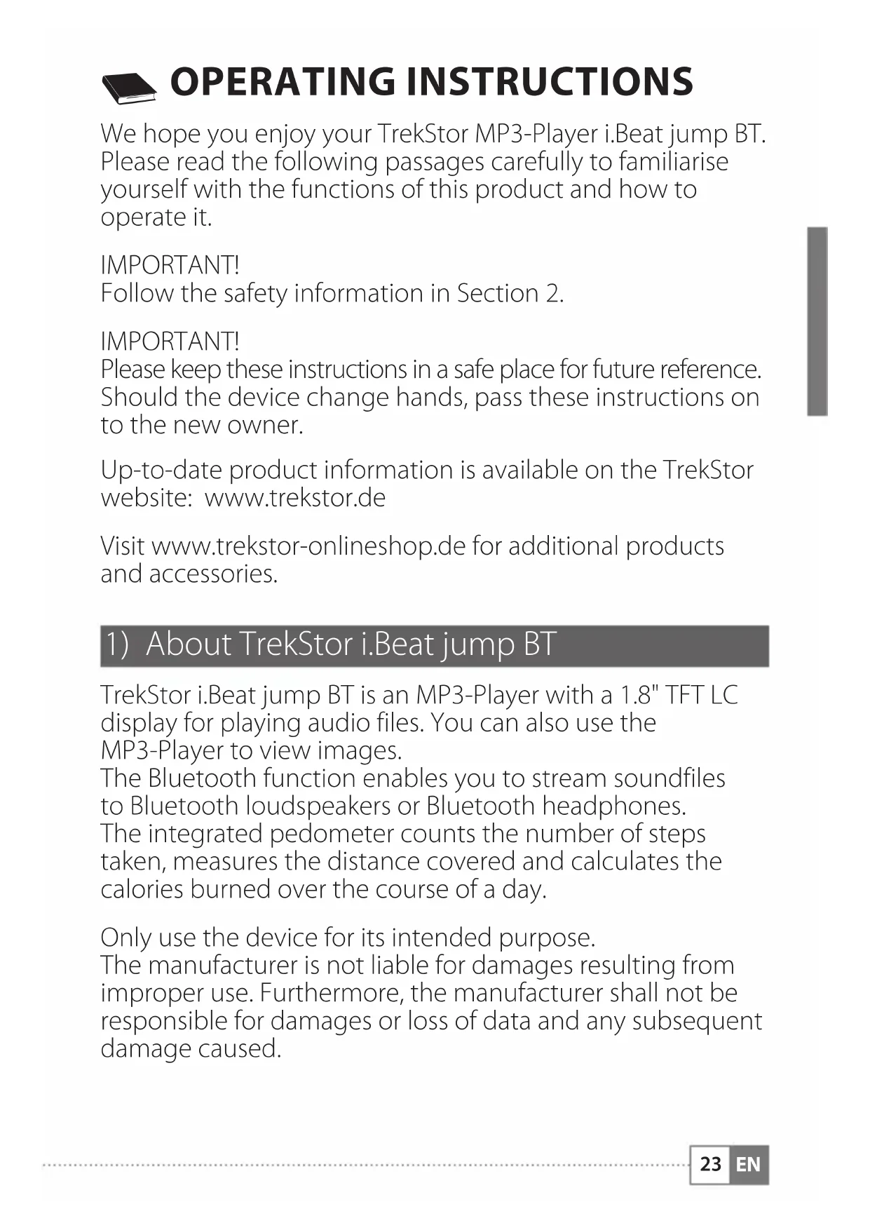OPERATING INSTRUCTIONS We hope you enjoy your TrekStor MP3-Player i.Beat jump BT. Please read the following passages carefully to familiarise yourself with the functions of this product and how to operate it. IMPORTANT! Follow the safety information in Section 2. IMPORTANT! Please keep these instructions in a safe place for future reference. Should the device change hands, pass these instructions on to the new owner. Up-to-date product information is available on the TrekStor website: www.trekstor.de Visit www.trekstor-onlineshop.de for additional products and accessories.