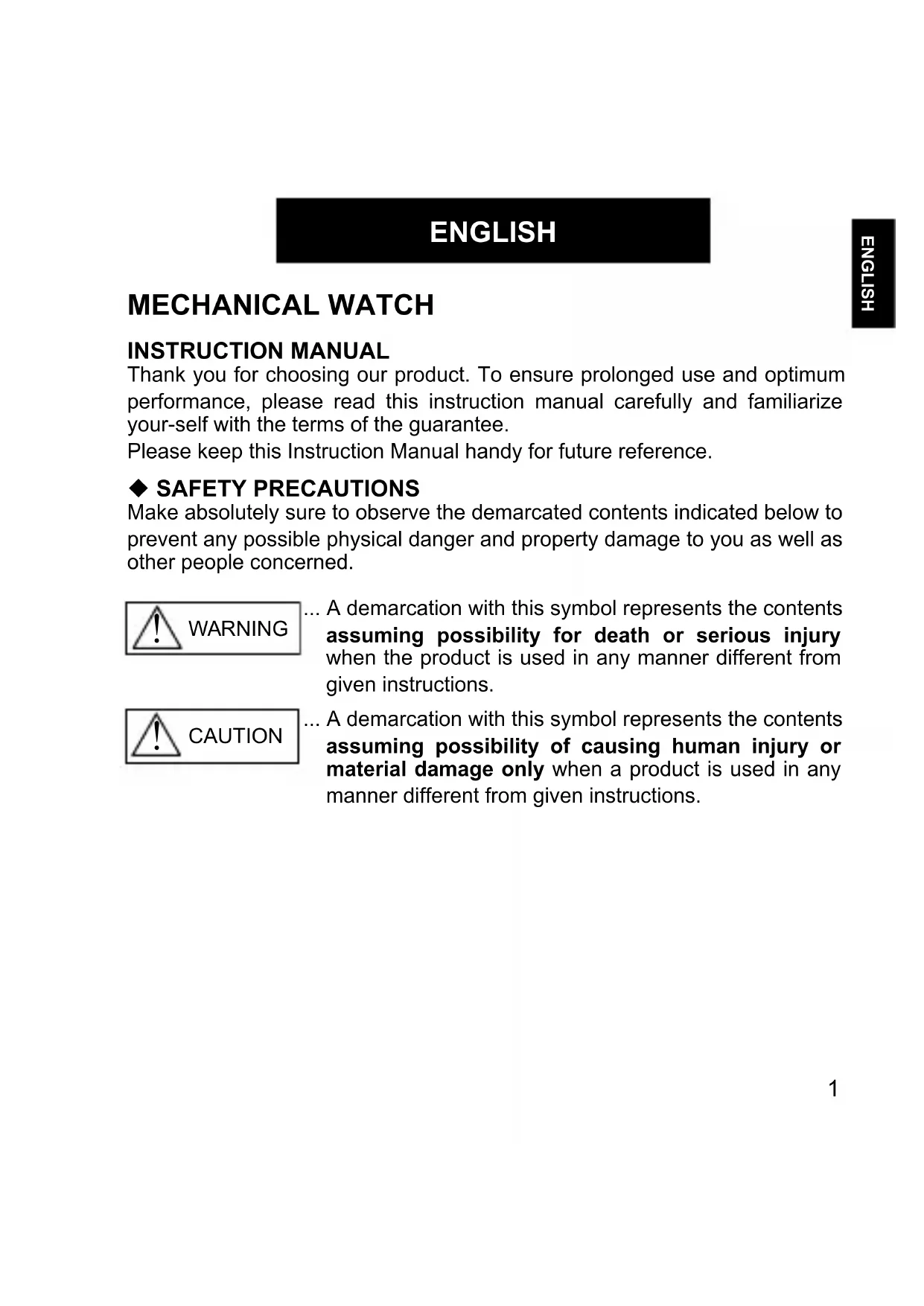 ENGLISH ENGLISH MECHANICAL WATCH INSTRUCTION MANUAL Thank you for choosing our product. To ensure prolonged use and optimum performance, please read this instruction manual carefully and familiarize your-self with the terms of the guarantee. Please keep this Instruction Manual handy for future reference. SAFETY PRECAUTIONS Make absolutely sure to observe the demarcated contents indicated below to prevent any possible physical danger and property damage to you as well as other people concerned..... A demarcation with this symbol represents the contents assuming possibility for death or serious injury when the product is used in any manner different from given instructions..... A demarcation with this symbol represents the contents assuming possibility of causing human injury or material damage only when a product is used in any manner different from given instructions. WARNING