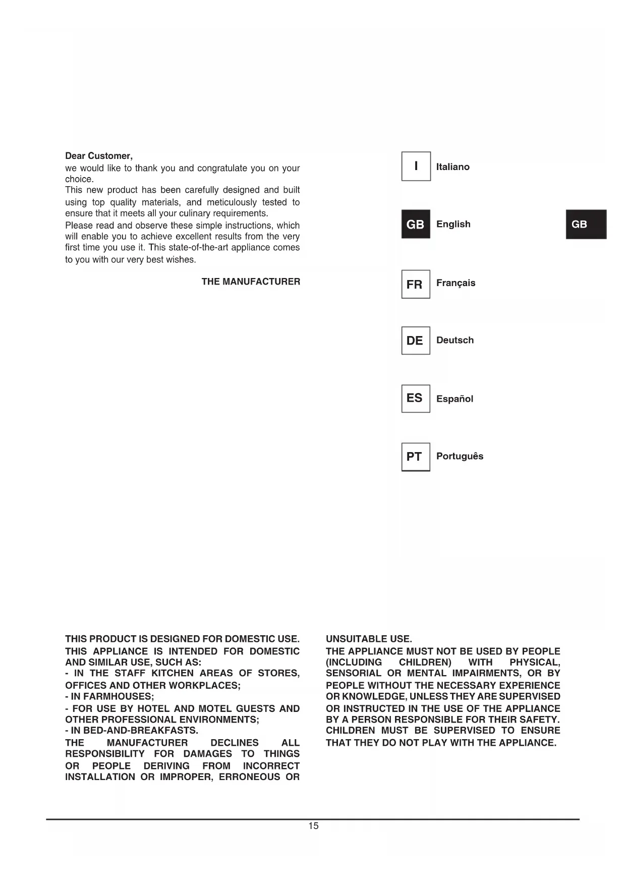 THAT THEY DO NOT PLAY WITH THE APPLIANCE. Dear Customer, we would like to thank you and congratulate you on your choice. This new product has been carefully designed and built using top quality materials, and meticulously tested to ensure that it meets all your culinary requirements. Please read and observe these simple instructions, which will enable you to achieve excellent results from the very first time you use it. This state-of-the-art appliance comes to you with our very best wishes. THE MANUFACTURER Italiano