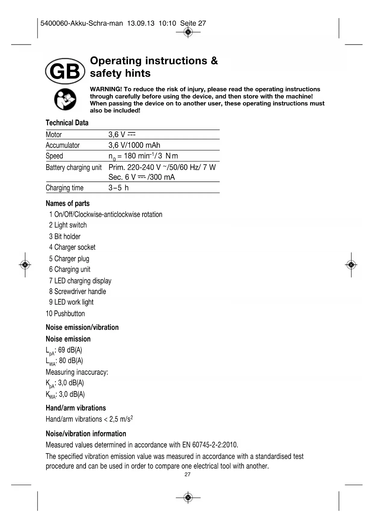 - Even after the expiry of the guarantee period, we would like to help you and carry out any repairs at a favourable price. 5400060-Akku-Schra-man 13.09.13 10:10 Seite 3334 Technische gegevens Motor 3,6 V ---