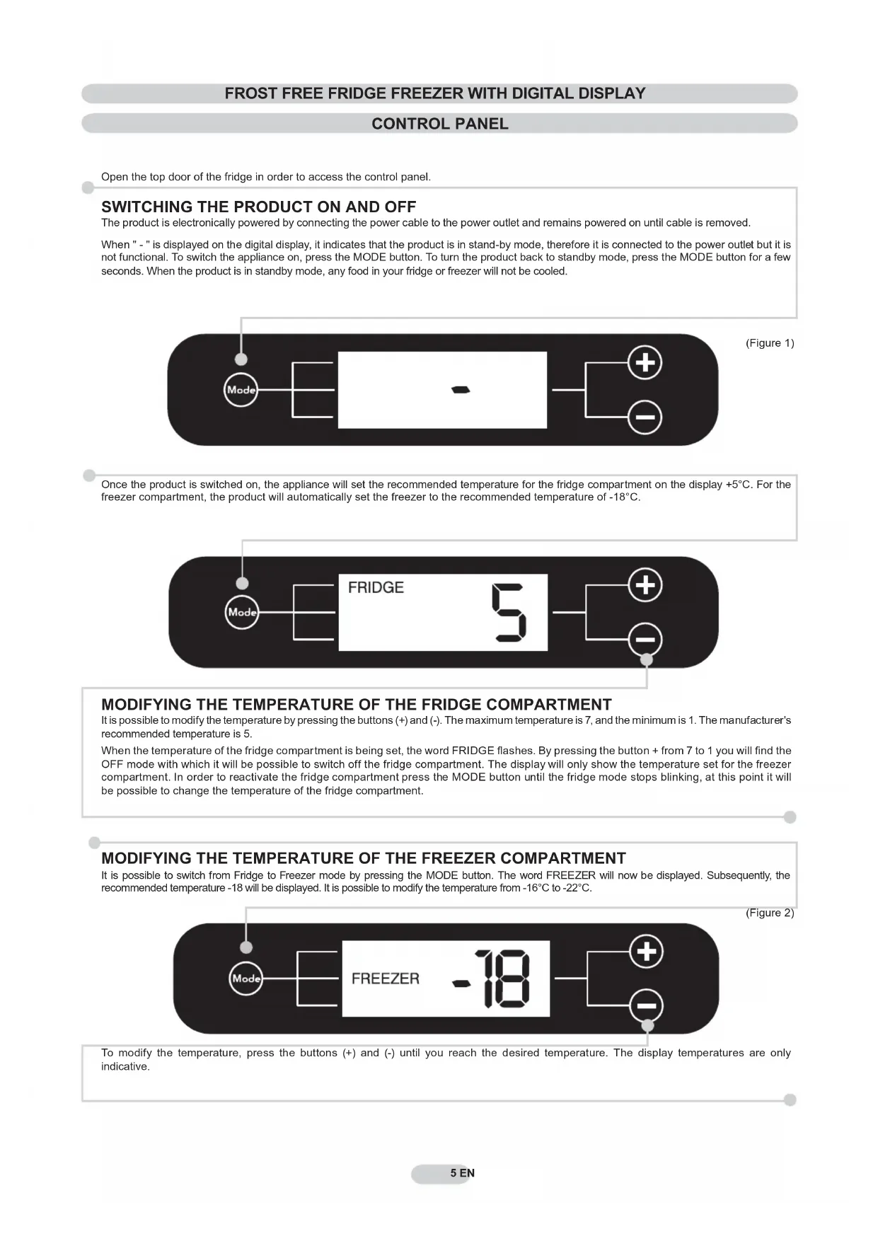 The product is electronically powered by connecting the power cable to the power outlet and remains powered on until cable is removed. When " - " is displayed on the digital display, it indicates that the product is in stand-by mode, therefore it is connected to the power outlet but it is not functional. To switch the appliance on, press the MODE button. To turn the product back to standby mode, press the MODE button for a few seconds. When the product is in standby mode, any food in your fridge or freezer will not be cooled. MODIFYING THE TEMPERATURE OF THE FRIDGE COMPARTMENT It is possible to modify the temperature by pressing the buttons (+) and (-). The maximum temperature is 7, and the minimum is 1. The manufacturer's recommended temperature is 5. When the temperature of the fridge compartment is being set, the word FRIDGE fl ashes. By pressing the button + from 7 to 1 you will fi nd the OFF mode with which it will be possible to switch off the fridge compartment. The display will only show the temperature set for the freezer compartment. In order to reactivate the fridge compartment press the MODE button until the fridge mode stops blinking, at this point it will be possible to change the temperature of the fridge compartment. MODIFYING THE TEMPERATURE OF THE FREEZER COMPARTMENT It is possible to switch from Fridge to Freezer mode by pressing the MODE button. The word FREEZER will now be displayed. Subsequently, the recommended temperature -18 will be displayed. It is possible to modify the temperature from -16°C to -22°C. To modify the temperature, press the buttons (+) and (-) until you reach the desired temperature. The display temperatures are only indicative. (Figure 1) (Figure 2) 5 IT5 EN Once the product is switched on, the appliance will set the recommended temperature for the fridge compartment on the display +5°C. For the freezer compartment, the product will automatically set the freezer to the recommended temperature of -18°C.6 EN