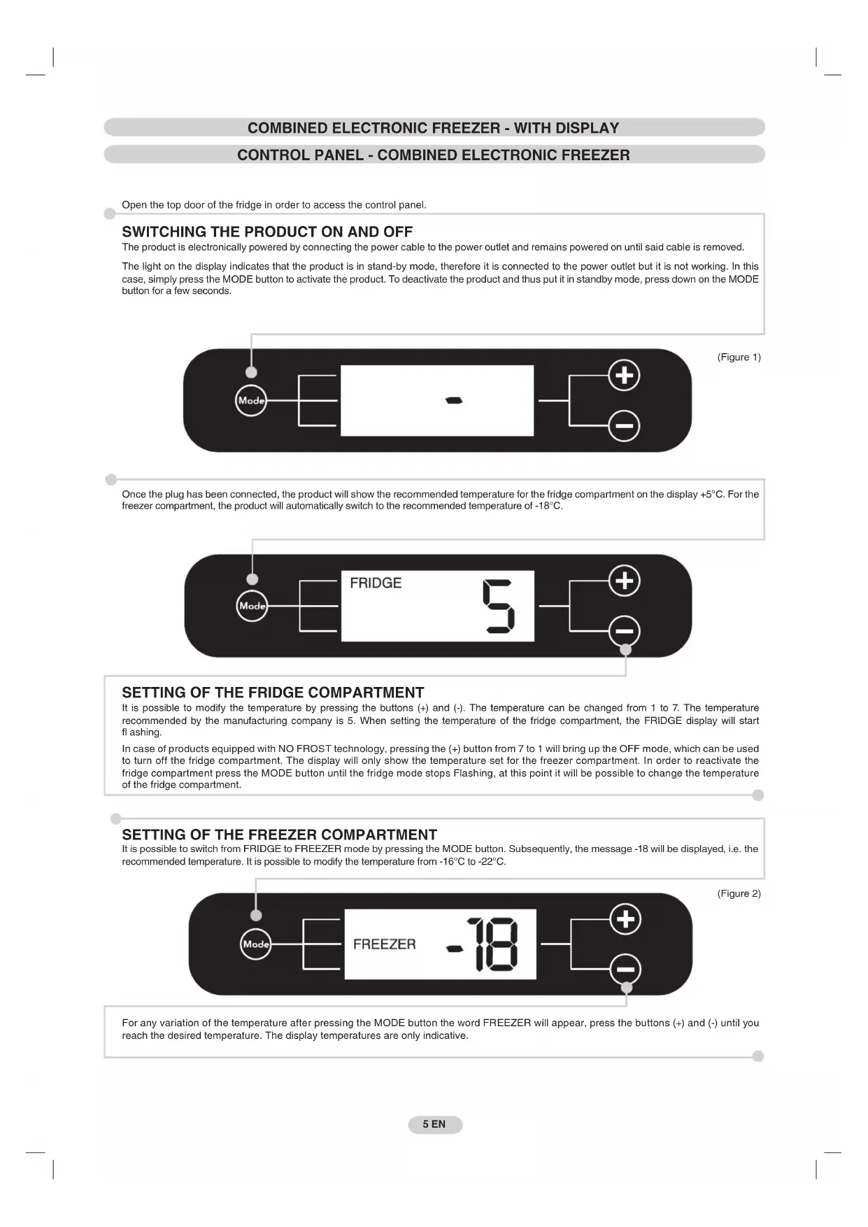 It is possible to modify the temperature by pressing the buttons (+) and (-). The temperature can be changed from 1 to 7. The temperature recommended by the manufacturing company is 5. When setting the temperature of the fridge compartment, the FRIDGE display will start fl ashing. In case of products equipped with NO FROST technology, pressing the (+) button from 7 to 1 will bring up the OFF mode, which can be used to turn off the fridge compartment. The display will only show the temperature set for the freezer compartment. In order to reactivate the fridge compartment press the MODE button until the fridge mode stops Flashing, at this point it will be possible to change the temperature of the fridge compartment.