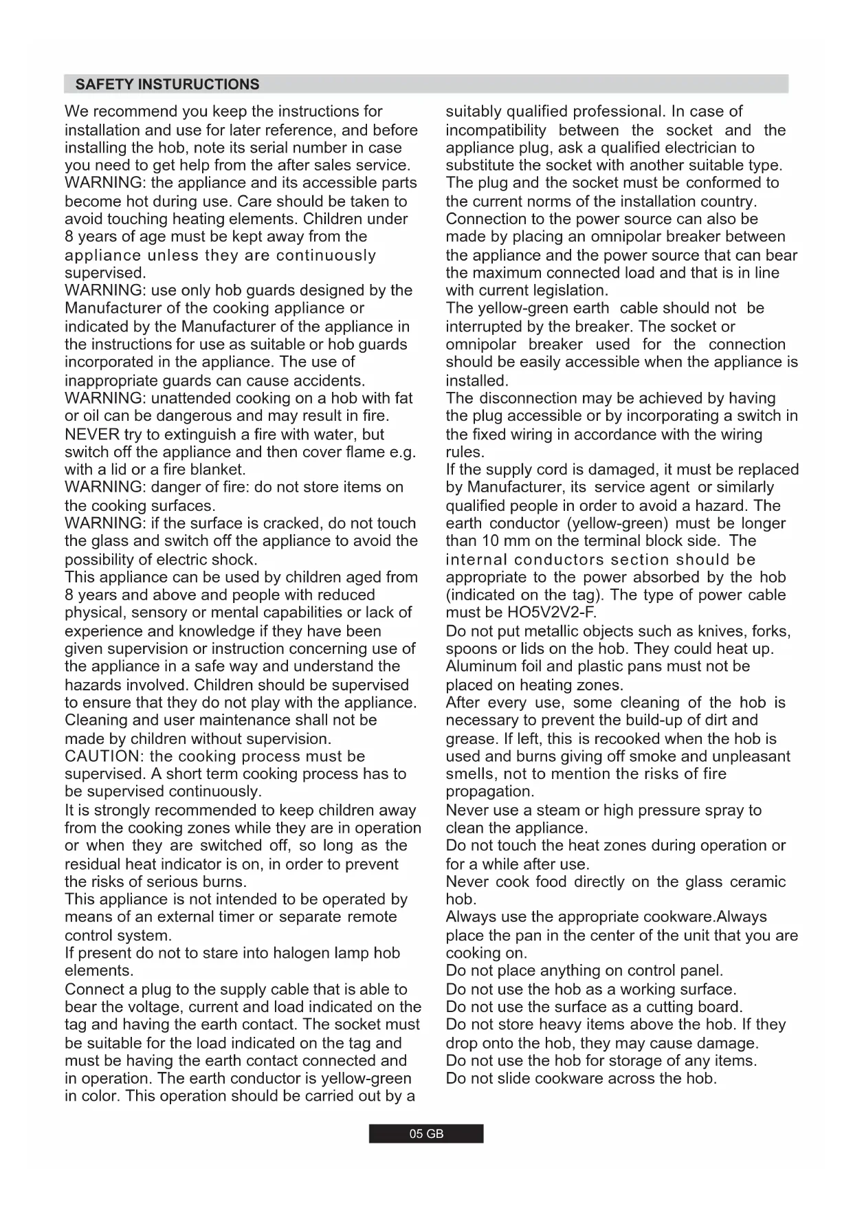 Warning - this appliance must be earthed This appliance is designed for domestic use only. Connection to the main supply must be made by a competant electrician, ensuring that all current regulations concerning such installations are observed.The appliance must only be connected to a suitably rated spur point, a3 pin 13 amp plug/socket is not suitable. A double pole switch must be provided and the circuit must have appropriate fuse protection. Further details of the power requirement of the individual product will be found in the users’ instruction and on the appliance rating plate. In the case of built-in product you are advised, should you wish to use a longer cable than the one supplied, that a suitably rated heat resistanttype must be used.The wiring must be connected to the mains supplyasfollows:CONNECT TO SPUR TERMINALGreen &Yellow Wire Earth ConnectionBlue Wire Neutral ConnectionBrown Wire Live Connection Note: We do not advocate the use of earth leakage devices with electric cooking appliances installed to spur points because of the «nuisance tripping» which may occur. You are again reminded that the appliance must be correctly earthed, the manufacturer declines any responsibility for any event occurring as a result of incorrect electricalinstallation. 2.1. ELECTRICAL CONNECTION Check the data on the rating plate, located on the outside of the unit, to ensure that the supply and input voltage are suitable.Before connection, check the earthing system.By Law, this appliance must be earthed. If this regulation is not compliedwith, the Manufacturer will not be responsible for any damage caused to persons or property. If a plug is not already attached, fit a plug appropriate to the load indicated on the rating plate. The earth wire is coloured yellow/green. The plug should always be accessible. Where the Hob is connected direct to the electricity supply, a circuit breaker must be fitted. If the power supply cord is damaged this is to be replaced by a qualified engineer so as to prevent any potential risk.The earth wire ( green and yellow coloured ) must be at least 10 mmlonger than the live and neutral wires. The section of the cable used must be of the correct size in relation to the absorbed power of the hob. Please check rating plate for the power details and ensure that the power supply cord is of the type 3x0.75 mm² H05 V2V2-F. LIVE EARTHNEUTRAL