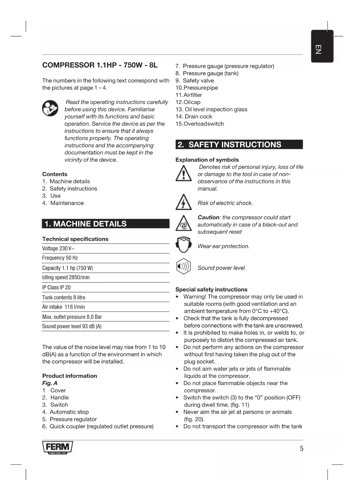 Technical specifications Voltage 230 V~ Frequency 50 Hz Capacity 1.1 hp (750 W) Idling speed 2850/min IP Class IP 20 Tank contents 8 litre Air intake 118 l/min Max. outlet pressure 8.0 Bar Sound power level 93 dB (A) The value of the noise level may rise from 1 to 10 dB(A) as a function of the environment in which the compressor will be installed. Product information Fig. A 1 Cover