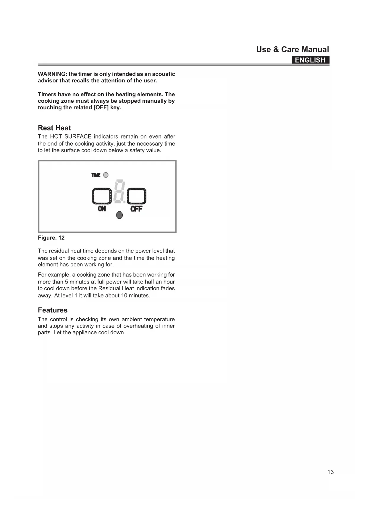 advisor that recalls the attention of the user. Timers have no effect on the heating elements. The cooking zone must always be stopped manually by touching the related [OFF] key. Rest Heat The HOT SURFACE indicators remain on even after the end of the cooking activity, just the necessary time to let the surface cool down below a safety value. Figure. 12 The residual heat time depends on the power level that was set on the cooking zone and the time the heating element has been working for. For example, a cooking zone that has been working for more than 5 minutes at full power will take half an hour to cool down before the Residual Heat indication fades away. At level 1 it will take about 10 minutes. Features The control is checking its own ambient temperature and stops any activity in case of overheating of inner parts. Let the appliance cool down.ENGLISH Use & Care Manual