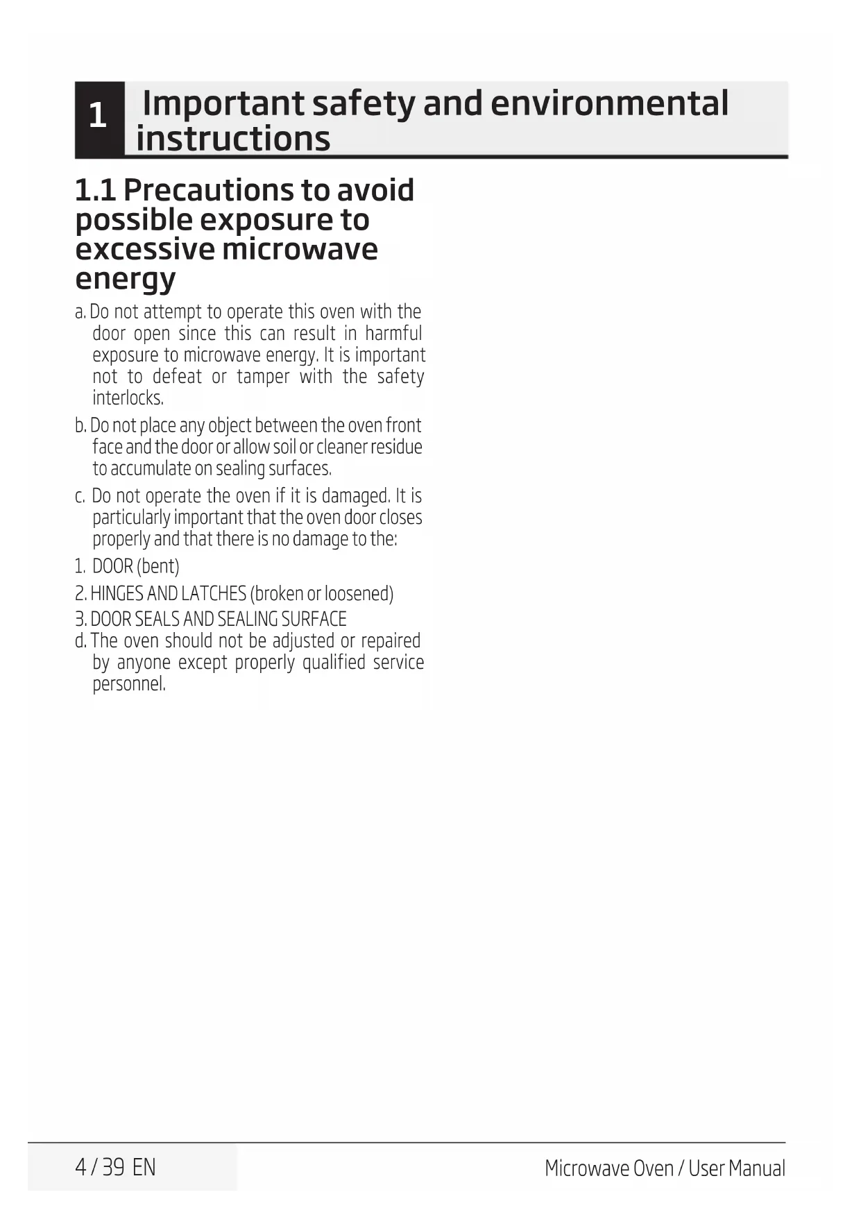 d. The oven should not be adjusted or repaired by anyone except properly qualified service personnel.5 / 39 EN Microwave Oven / User Manual