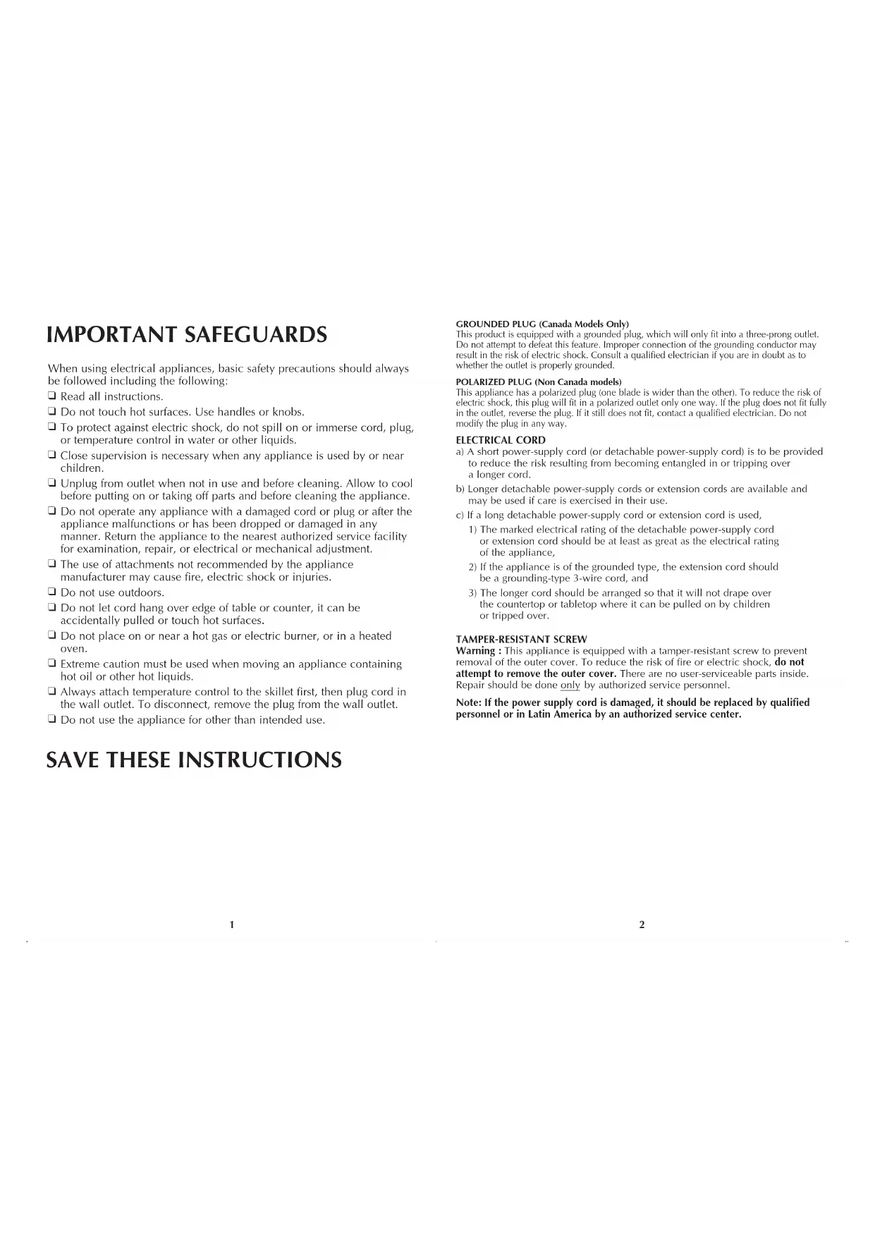 GROUNDED PLUG (Canada Models Only) This product is equipped with a grounded plug, which will only fit into a three-prong outlet. Do not attempt to defeat this feature. Improper connection of the grounding conductor may result in the risk of electric shock. Consult a qualified electrician if you are in doubt as to whether the outlet is properly grounded. POLARIZED PLUG (Non Canada models) This appliance has a polarized plug (one blade is wider than the other). To reduce the risk of electric shock, this plug will fit in a polarized outlet only one way. If the plug does not fit fully in the outlet, reverse the plug. If it still does not fit, contact a qualified electrician. Do not modify the plug in any way. ELECTRICAL CORD a) A short power-supply cord (or detachable power-supply cord) is to be provided to reduce the risk resulting from becoming entangled in or tripping over a longer cord. b) Longer detachable power-supply cords or extension cords are available and may be used if care is exercised in their use. c) If a long detachable power-supply cord or extension cord is used,