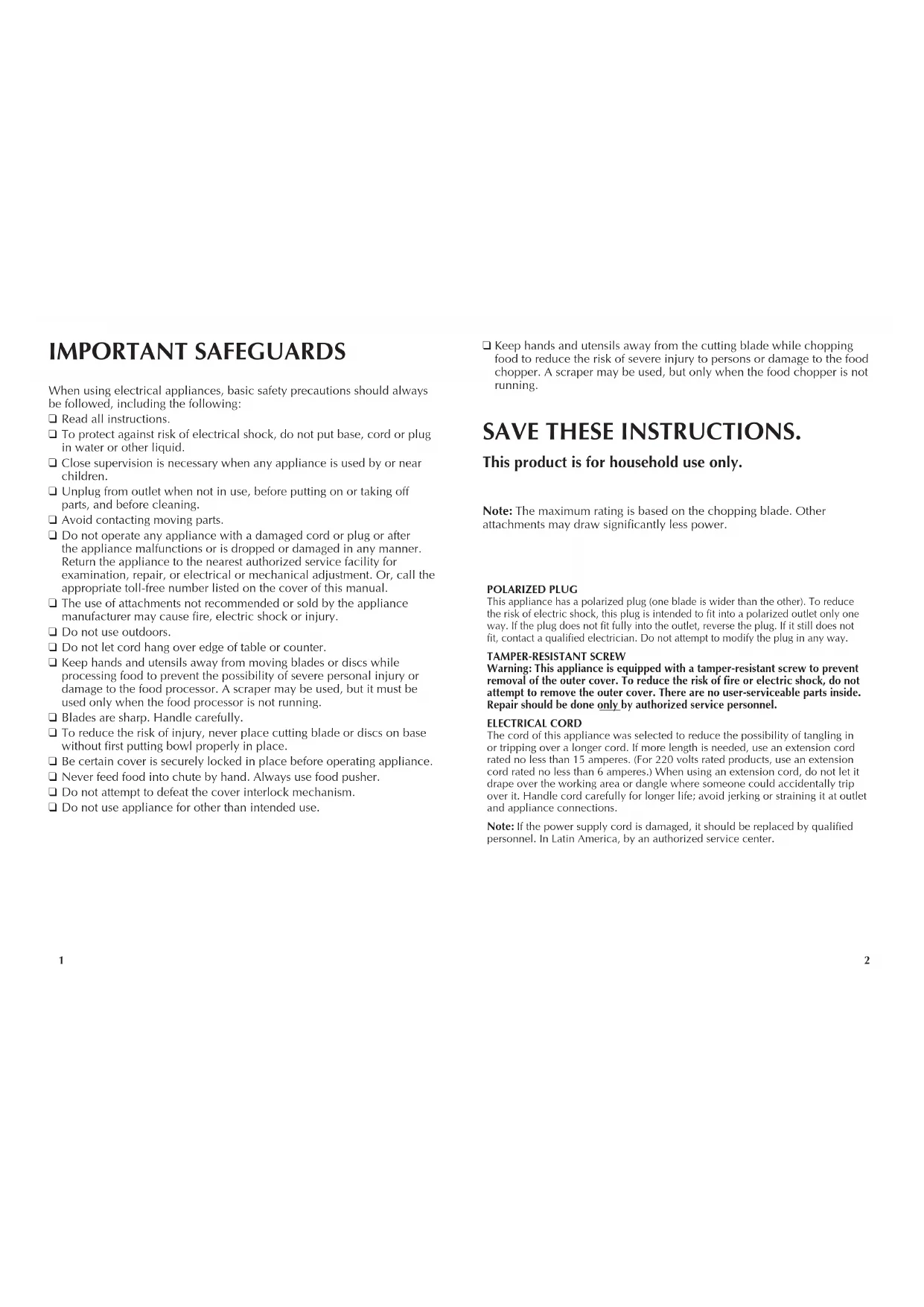 Keep hands and utensils away from the cutting blade while chopping food to reduce the risk of severe injury to persons or damage to the food chopper. A scraper may be used, but only when the food chopper is not running. Note:The maximum rating is based on the chopping blade. Other attachments may draw signicantly less power.4