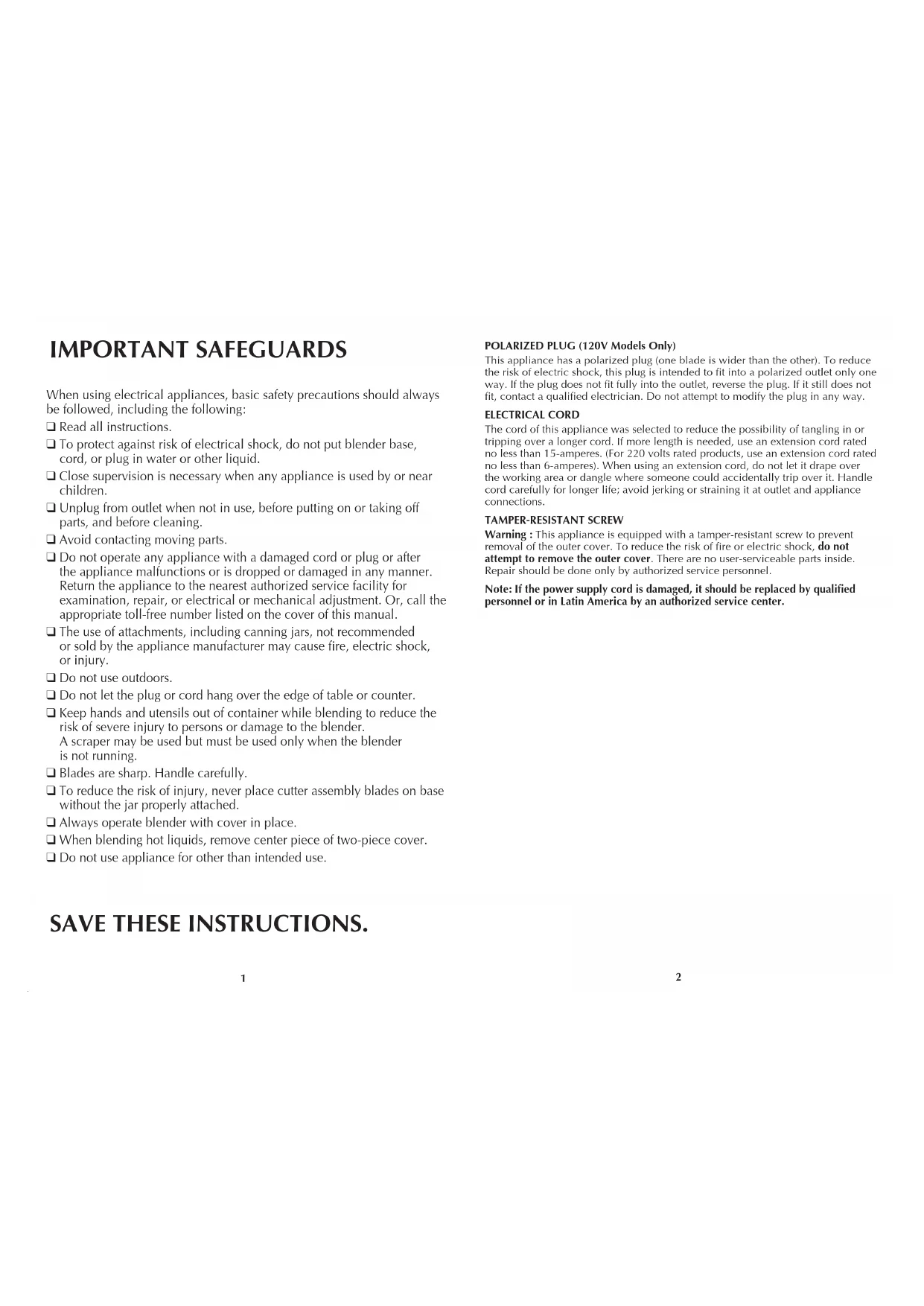 When using electrical appliances, basic safety precautions should always be followed, including the following: q Read all instructions. q To protect against risk of electrical shock, do not put blender base, cord, or plug in water or other liquid. q Close supervision is necessary when any appliance is used by or near children. q Unplug from outlet when not in use, before putting on or taking off parts, and before cleaning. q Avoid contacting moving parts. q Do not operate any appliance with a damaged cord or plug or after the appliance malfunctions or is dropped or damaged in any manner. Return the appliance to the nearest authorized service facility for examination, repair, or electrical or mechanical adjustment. Or, call the appropriate toll-free number listed on the cover of this manual. q The use of attachments, including canning jars, not recommended or sold by the appliance manufacturer may cause fire, electric shock, or injury. q Do not use outdoors. q Do not let the plug or cord hang over the edge of table or counter. q Keep hands and utensils out of container while blending to reduce the risk of severe injury to persons or damage to the blender. A scraper may be used but must be used only when the blender is not running. q Blades are sharp. Handle carefully. q To reduce the risk of injury, never place cutter assembly blades on base without the jar properly attached. q Always operate blender with cover in place. q When blending hot liquids, remove center piece of two-piece cover. q Do not use appliance for other than intended use. IMPORTANT SAFEGUARDS SAVE THESE INSTRUCTIONS. POLARIZED PLUG (120V Models Only) This appliance has a polarized plug (one blade is wider than the other). To reduce the risk of electric shock, this plug is intended to fit into a polarized outlet only one way. If the plug does not fit fully into the outlet, reverse the plug. If it still does not fit, contact a qualified electrician. Do not attempt to modify the plug in any way. ELECTRICAL CORD The cord of this appliance was selected to reduce the possibility of tangling in or tripping over a longer cord. If more length is needed, use an extension cord rated no less than 15-amperes. (For 220 volts rated products, use an extension cord rated no less than 6-amperes). When using an extension cord, do not let it drape over the working area or dangle where someone could accidentally trip over it. Handle cord carefully for longer life; avoid jerking or straining it at outlet and appliance connections. TAMPER-RESISTANT SCREW
