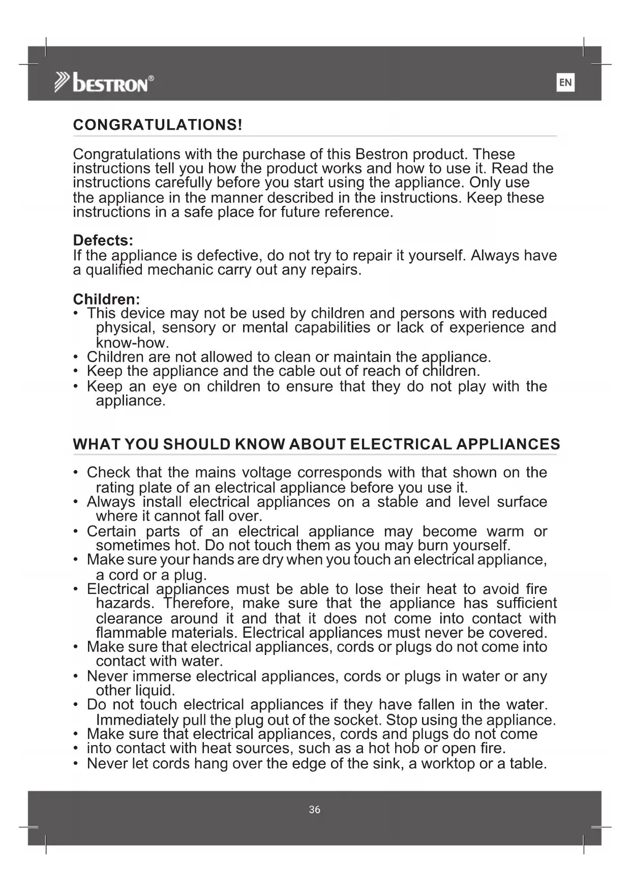 NLCONGRATULATIONS! Congratulations with the purchase of this Bestron product. These instructions tell you how the product works and how to use it. Read the instructions carefully before you start using the appliance. Only use the appliance in the manner described in the instructions. Keep these instructions in a safe place for future reference. Defects: If the appliance is defective, do not try to repair it yourself. Always have a qualified mechanic carry out any repairs. Children: