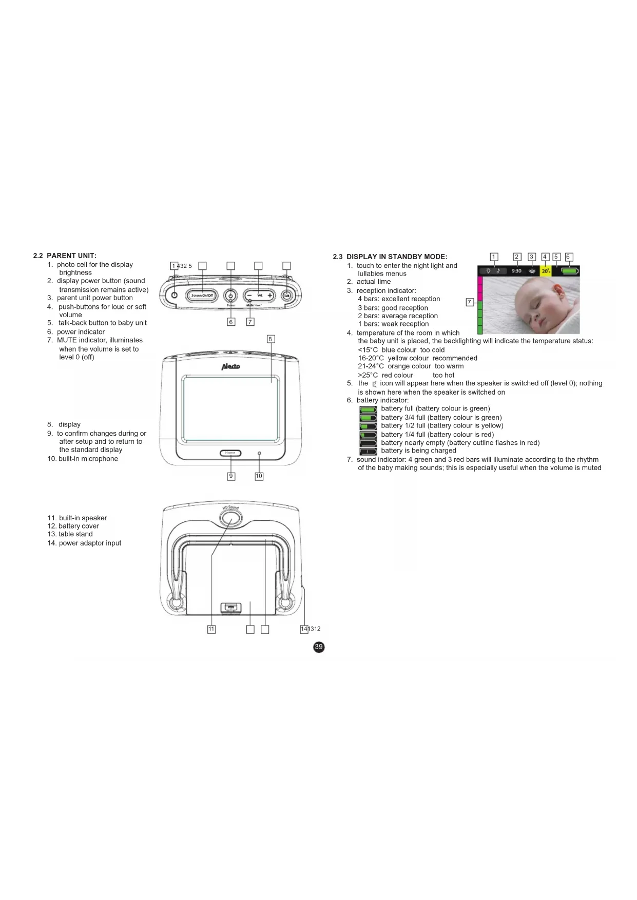 the baby unit is placed, the backlighting will indicate the temperature status: <15°C blue colour too cold 16-20°C yellow colour recommended 21-24°C orange colour too warm >25°C red colour too hot