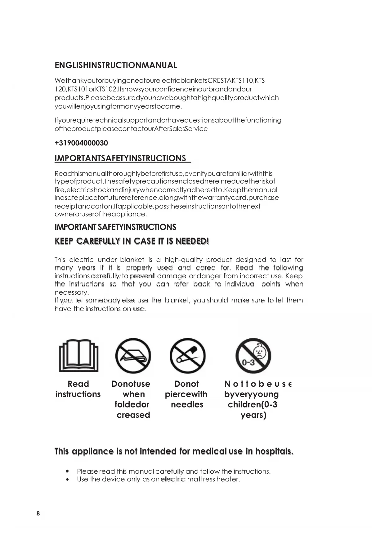 We thank you for buying one of our electric blankets CRESTA KTS 110, KTS 120, KTS 101 or KTS 102. It shows your confidence in our brand and our products. Please be assured you have bought a high quality product which you will enjoy using for many years to come. If you require technical support and or have questions about the functioning of the product please contact our After Sales Service + 31 900 4000030