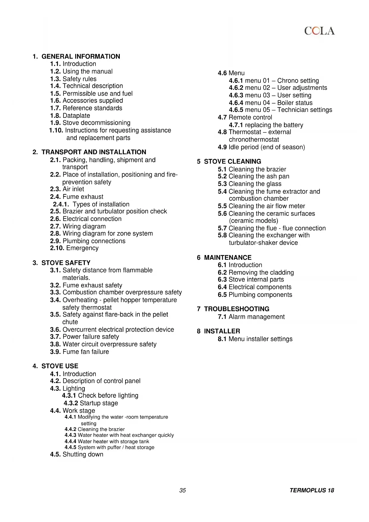 - Read the use and maintenance manual before installing, lighting and servicing the stove. - Have installation, the electrical connection, testing and maintenance carried out by a qualified and/or authorised technician. - Connect the stove to an approved flue by means of an inspectionable terminal; several units can be connected only if allowed by the local regulations and by the flue inspection Body. - Connect the stove to the suction system by means of a pipe or air inlet from outside. - Connect the stove to an approved 230 V-50 Hz electrical socket. - With the TERMO model, connect the unit to the heating system; under no circumstances can it be used without the water connection and without water in the heating chamber. - Make sure the electrical system and the sockets are suitable for the maximum absorption of the unit, specified on the label and in this manual. - The stove must be unplugged and cold before carrying out any maintenance. - Do not use flammable liquids or substances to light the stove or rekindle the flame: when the stove is lit, pellet ignition is automatic. - The pellet stove must only be fed with wood pellets having the characteristics described in this manual. - The stove must not be used as an incinerator. - Never block the combustion air inlet and fume outlet openings. - Do not handle easily flammable or explosive substances near the stove while it is operating. - Do not remove the pellet hopper protection grille. - Do not operate the stove with the fire door open and/or the glass damaged or broken. - During operation the intense heat generated by combustion of the pellets makes the external surfaces of the stove very hot, and in particular the fire door, handle and flue pipe. Therefore avoid contact with these parts without suitable protection. - Keep objects that are flammable and/or not heat resistant at a suitably safe distance. - Clean the brazier regularly every time the stove is lit or whenever reloading pellets. - Avoid the creation of smoke and unburnt products during lighting and/or normal operation; an excessive accumulation of unburnt pellets in the brazier must be eliminated manually before relighting the stove. - Have the pipe and smoke baffles inside the combustion chamber cleaned regularly by qualified personnel. - Warn children and guests about the hazards described above. - In case of operation problems, the stove can be relit only after eliminating the cause of the problem. - Any tampering and/or unauthorised replacements with non-original parts of the stove can create a risk for the user's safety and relieves the manufacturer of any civil or penal liability. - Only use original replacement parts recommended by the manufacturer. The manufacturer declines any liability for problems, damage or accidents caused by failure to follow or apply the instructions contained in this manual.37 TERMOPLUS 18