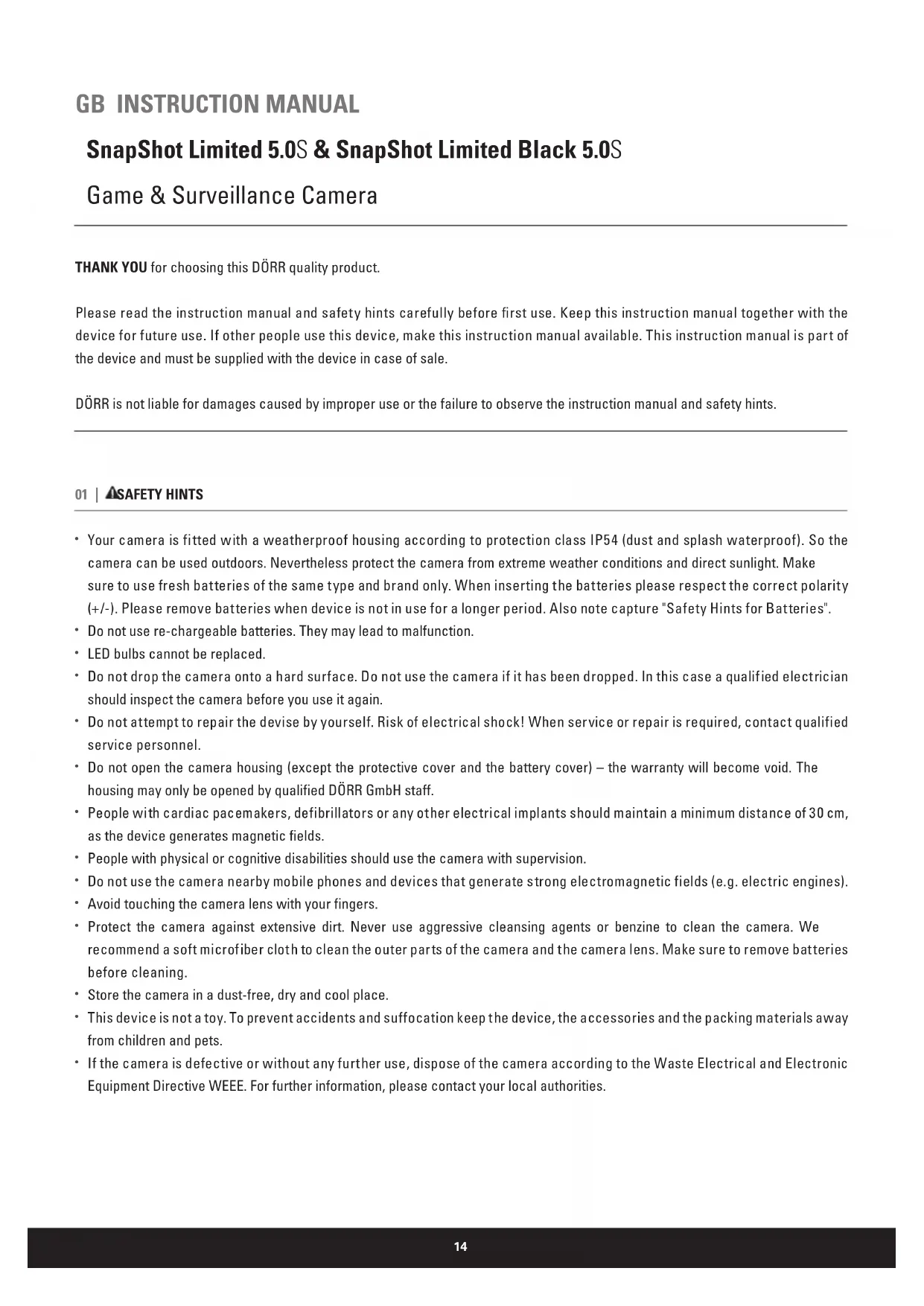 1x Game & Surveillance Camera 1x Mounting strap 1x Quick instruction22 Memory card The camera only works with an SD card. There are SD cards which may not harmonize with the DÖRR SnapShot and may aect function of camera. Usually it already helps to use another SD card of dierent brand or dierent capacity. The camera supports SD cards up to 32 GB. Lens rattles The camera lens is covered with a filter which allows coloured pictures at daylight and black & white shots at night. When camera is turned o the filter is not fixed which can cause the rattle noise. However, this is no defect! Weather protection Although the camera is weatherproof and well-suited for outdoor use, we recommend to mount it at a secured place, so not on the weather side or in the direct sunshine. After long periods of humidity, caused by rain or fog, the camera should be stored in a dry area for a few days. Dust and splash waterproof accor- ding to protection class IP54. Motion sensor The motion sensor will react under certain circumstances and within a certain range. In general the range of recognition is slightly larger than the range covered by the image. The recognition of the objects de- pends on temperature, vegetal cover, reflecting surfaces and more circumstances. Under optimum condi- tions, a perfectly oriented camera and high sensitivity level adjustment, the recognition range can be up to 12 - 15 m. Usually, you may expect a range of 10 m. It can take a few attempts to find the proper position for your camera. When you test the motion sensor reaction, be aware of the facts that animals are usually remarkably smaller than human beings. So they may not be recognized. Light conditions Avoid direct back light, as you do in normal photography. When you choose the camera position, make sure that there will be no direct back light and also that the camera will not be placed in the shadow. Technical changes Specifications and design are subject to change without notice. Latest manuals please download here: http://download.doerrfoto.info/manuals/Snapshot_20manuals/ 13 | HINTS & TIPS23 14 | DISPOSAL, CE MARKING, EU DECLARATION OF CONFORMITY