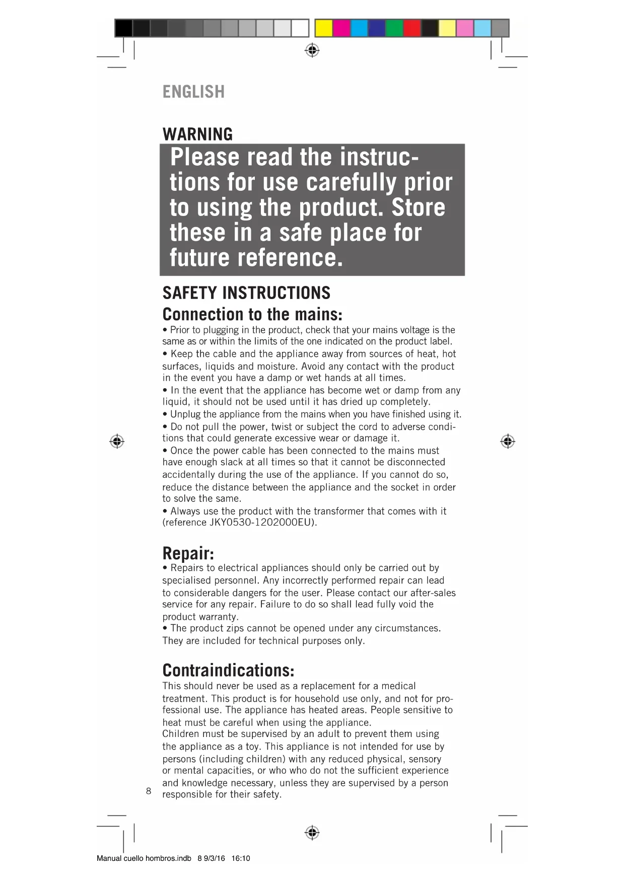 - The product zips cannot be opened under any circumstances. They are included for technical purposes only. Contraindications: This should never be used as a replacement for a medical treatment. This product is for household use only, and not for pro- fessional use. The appliance has heated areas. People sensitive to heat must be careful when using the appliance. Children must be supervised by an adult to prevent them using the appliance as a toy. This appliance is not intended for use by persons (including children) with any reduced physical, sensory or mental capacities, or who who do not the sufficient experience and knowledge necessary, unless they are supervised by a person responsible for their safety. Manual cuello hombros.indb 8 9/3/16 16:10ENGLISH