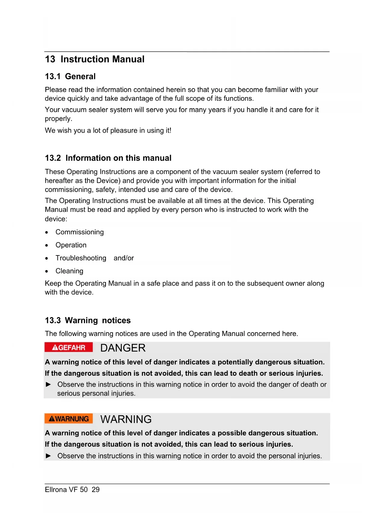 The following warning notices are used in the Operating Manual concerned here. DANGER A warning notice of this level of danger indicates a potentially dangerous situation. If the dangerous situation is not avoided, this can lead to death or serious injuries. ► Observe the instructions in this warning notice in order to avoid the danger of death or serious personal injuries. WARNING A warning notice of this level of danger indicates a possible dangerous situation. If the dangerous situation is not avoided, this can lead to serious injuries. ► Observe the instructions in this warning notice in order to avoid the personal injuries.Ellrona VF 50 30 ATTENTION A warning notice of this level of danger indicates a possible dangerous situation. If the dangerous situation is not avoided, this can lead to slight or moderate injuries. ► Observe the instructions in this warning notice in order to avoid the personal injuries. PLEASE NOTE A notice of this kind indicates additional information, which will simplify the handling of the machine.