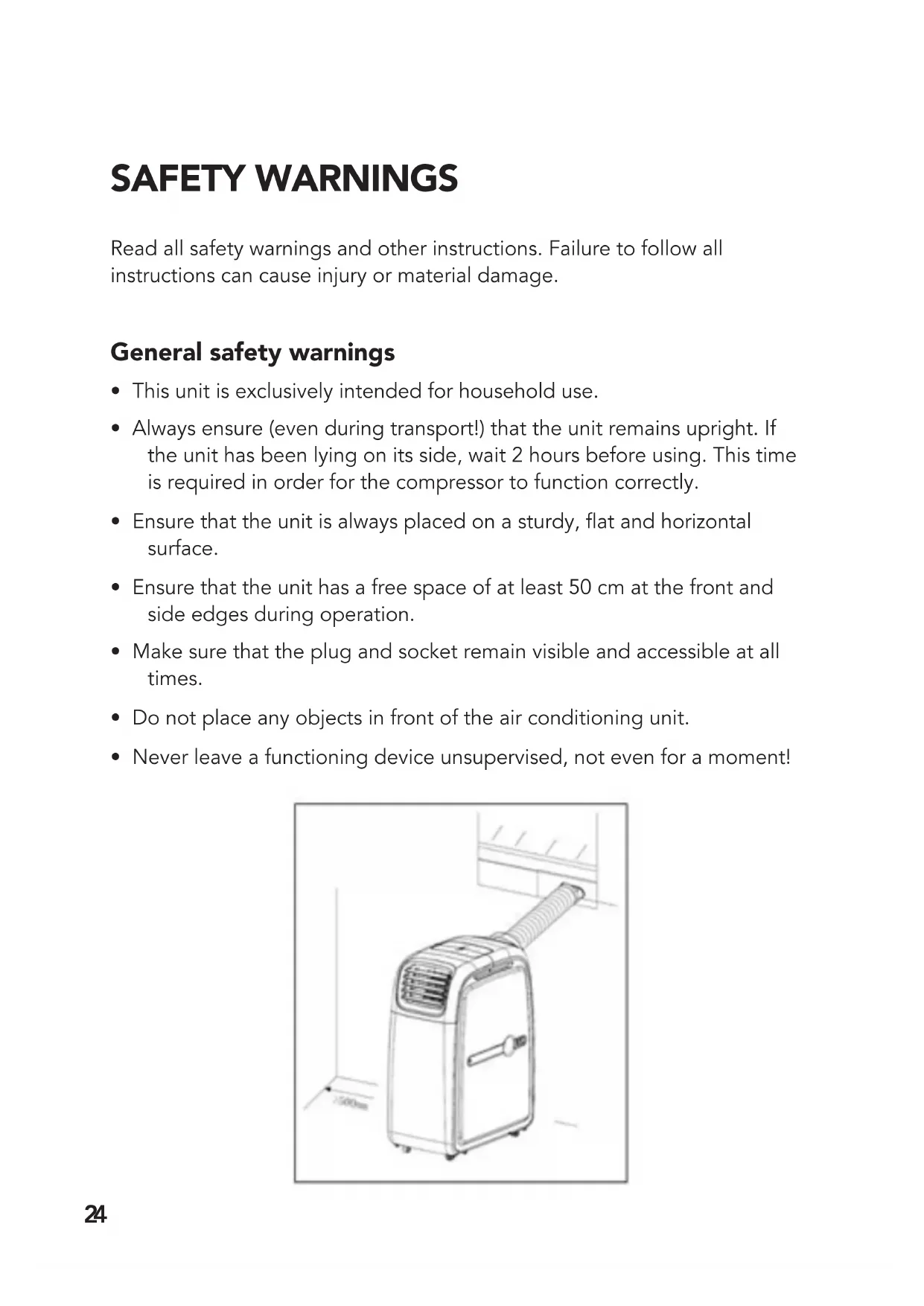 - This unit is exclusively intended for household use.• Always ensure (even during transport!) that the unit remains upright. If the unit has been lying on its side, wait 2 hours before using. This time is required in order for the compressor to function correctly.• Ensure that the unit is always placed on a sturdy, at and horizontal surface.• Ensure that the unit has a free space of at least 50 cm at the front and side edges during operation.• Make sure that the plug and socket remain visible and accessible at all times.• Do not place any objects in front of the air conditioning unit.• Never leave a functioning device unsupervised, not even for a moment!25