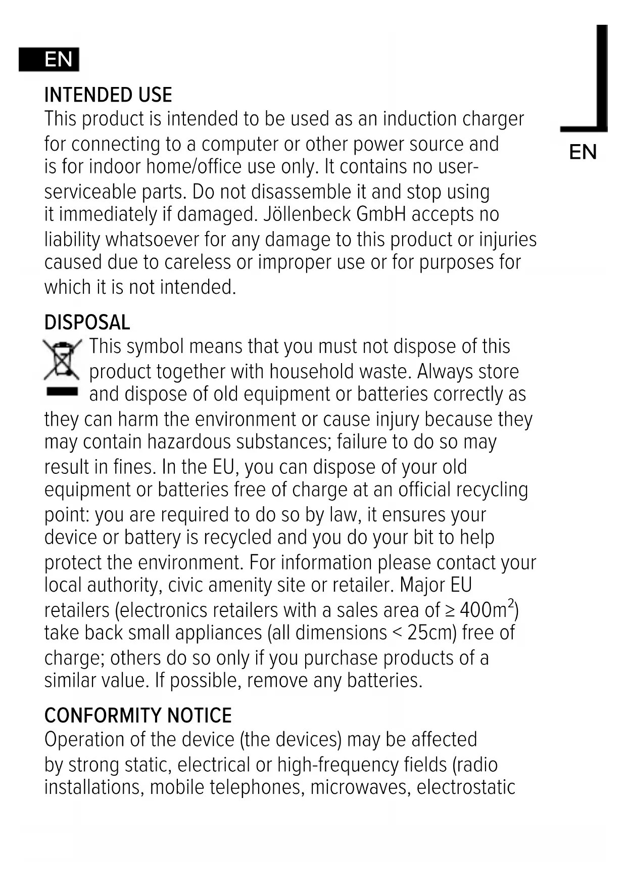 INTENDED USE This product is intended to be used as an induction charger for connecting to a computer or other power source and is for indoor home/oce use only. It contains no user- serviceable parts. Do not disassemble it and stop using it immediately if damaged. Jöllenbeck GmbH accepts no liability whatsoever for any damage to this product or injuries caused due to careless or improper use or for purposes for which it is not intended. DISPOSAL This symbol means that you must not dispose of this product together with household waste. Always store and dispose of old equipment or batteries correctly as they can harm the environment or cause injury because they may contain hazardous substances; failure to do so may result in fines. In the EU, you can dispose of your old equipment or batteries free of charge at an ocial recycling point: you are required to do so by law, it ensures your device or battery is recycled and you do your bit to help protect the environment. For information please contact your local authority, civic amenity site or retailer. Major EU retailers (electronics retailers with a sales area of ≥ 400m²) take back small appliances (all dimensions < 25cm) free of charge; others do so only if you purchase products of a similar value. If possible, remove any batteries. CONFORMITY NOTICE Operation of the device (the devices) may be aected by strong static, electrical or high-frequency fields (radio installations, mobile telephones, microwaves, electrostaticdischarges). If this occurs, try increasing the distance from the devices causing the interference. FCC STATEMENT This equipment has been tested and found to comply with the limits for a Class B digital device, pursuant to part 15 of the FCC Rules. These limits are designed to provide reasonable protection against harmful interference in a residential installation. This equipment generates, uses and can radiate radio frequency energy and, if not installed and used in accordance with the instructions, may cause harmful interference to radio communications. However, there is no guarantee that interference will not occur in a particular installation. If this equipment does cause harmful interference to radio or television reception, which can be determined by turning the equipment o and on, the user is encouraged to try to correct the interference by one or more of the following measures: