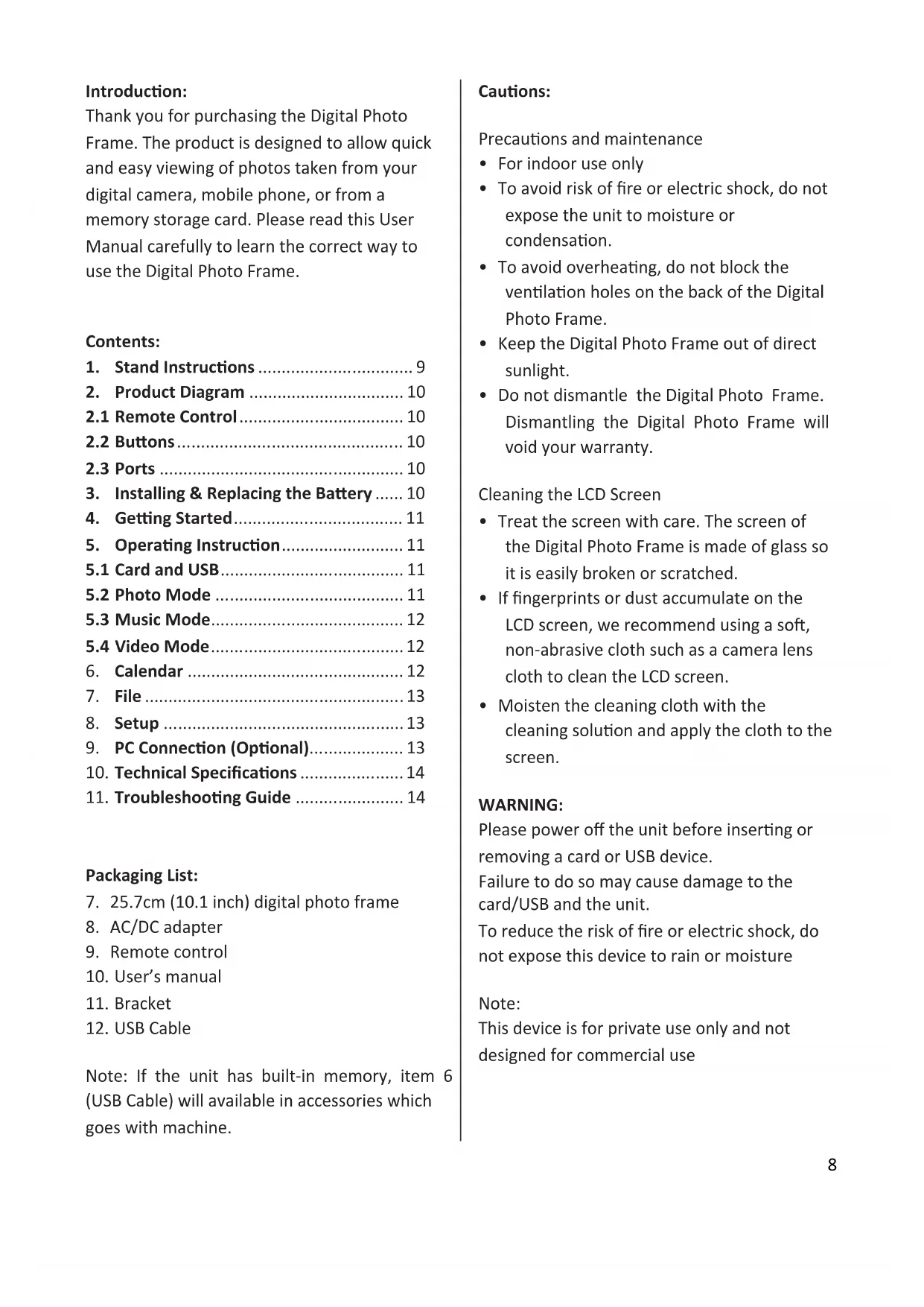 - Do not dismantle the Digital Photo Frame. Dismantling the Digital Photo Frame will void your warranty. Cleaning the LCD Screen