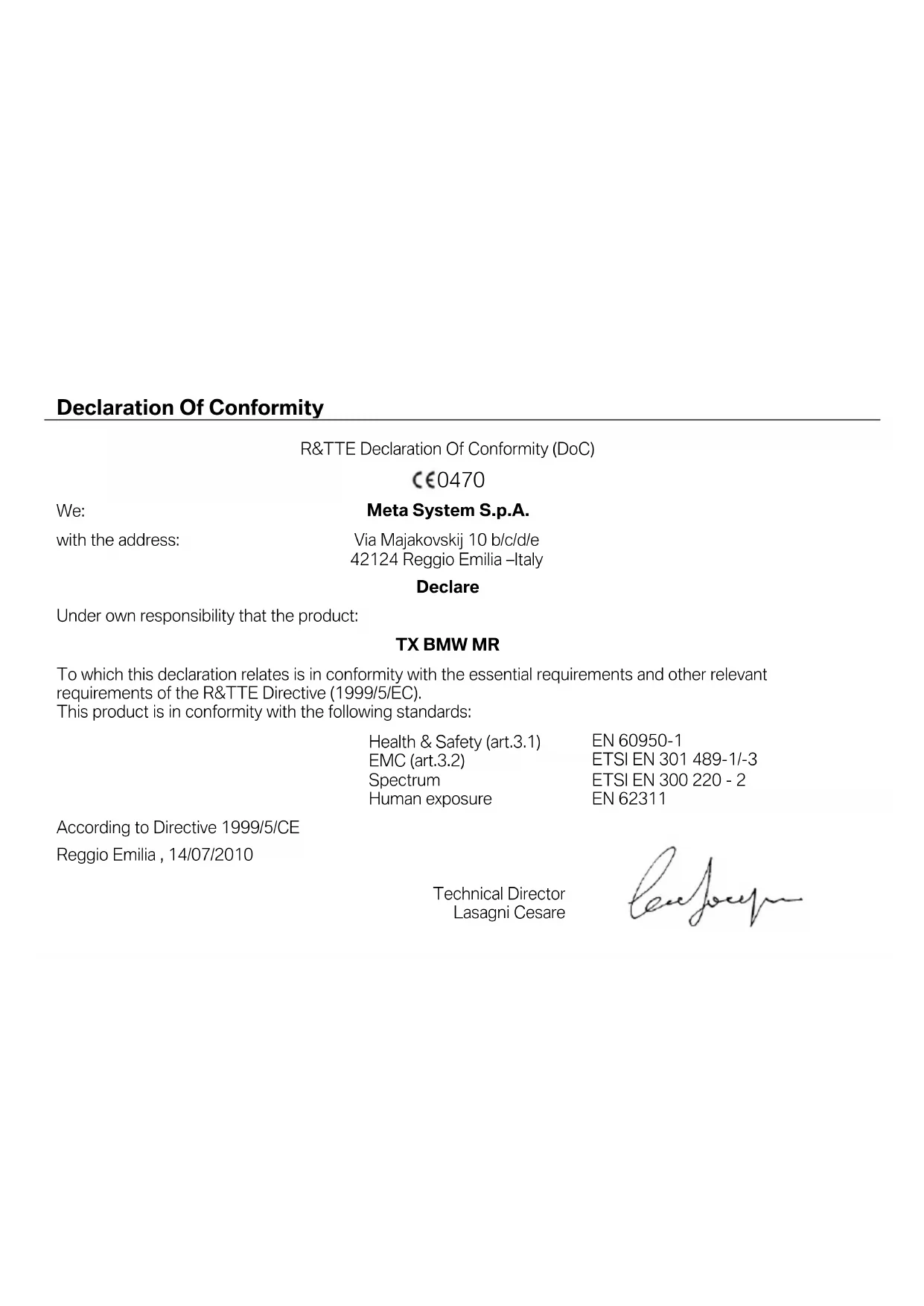 According to Directive 1999/5/CE Reggio Emilia , 14/07/2010
