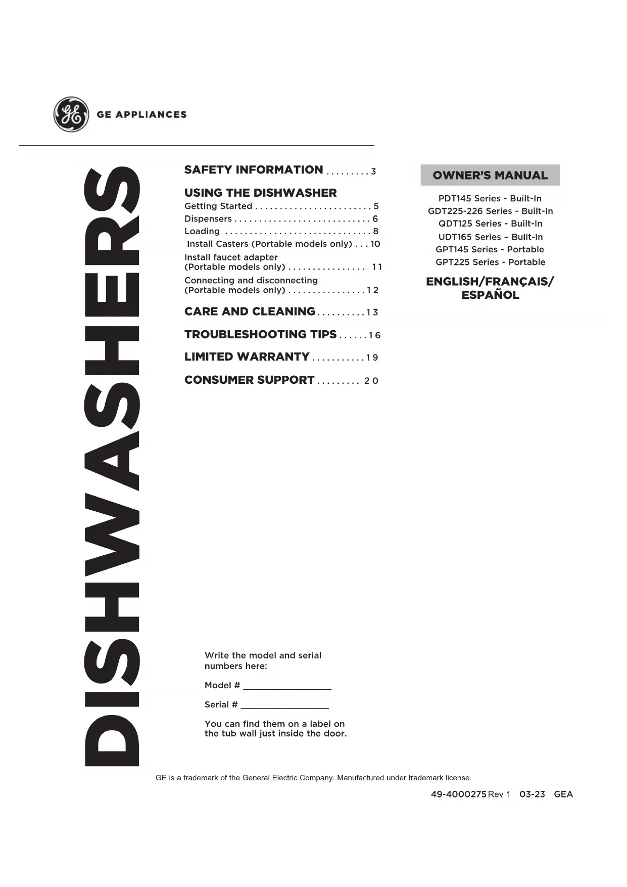 TROUBLESHOOTING TIPS ......16 LIMITED WARRANTY ...........19 CONSUMER SUPPORT ......... 20 PDT145 Series - Built-In GDT225-226 Series - Built-In QDT125 Series - Built-In UDT165 Series – Built-in GPT145 Series - Portable GPT225 Series - Portable2 49-4000275 Rev 1 THANK YOU FOR MAKING GE APPLIANCES A PART OF YOUR HOME. Whether you grew up with GE Appliances, or this is your first, we’re happy to have you in the family. We take pride in the craftsmanship, innovation and design that goes into every GE Appliances product, and we think you will too. Among other things, registration of your appliance ensures that we can deliver important product information and warranty details when you need them. Register your GE appliance now online. Helpful websites and phone numbers are available in the Consumer Support section of this Owner’s Manual. You may also mail in the pre-printed registration card included in the packing material.49-4000275 Rev 1 3
