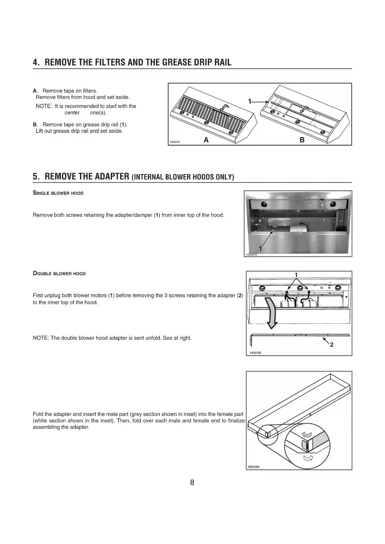 First unplug both blower motors (1) before removing the 3 screws retaining the adapter (2) to the inner top of the hood. NOTE: The double blower hood adapter is sent unfold. See at right. A. Remove tape on filters. Remove filters from hood and set aside. NOTE: It is recommended to start with the center one(s). B. Remove tape on grease drip rail (1). Lift out grease drip rail and set aside.