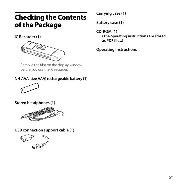 - Precautions Checking the Contents of the Package IC Recorder (1) Carrying case (1) Battery case (1) CD-ROM (1) (The operating instructions are stored as PDF files.) Operating Instructions Remove the film on the display window before you use the IC recorder. NH-AAA (size AAA) rechargeable battery (1) Stereo headphones (1) USB connection support cable (1) p. 29