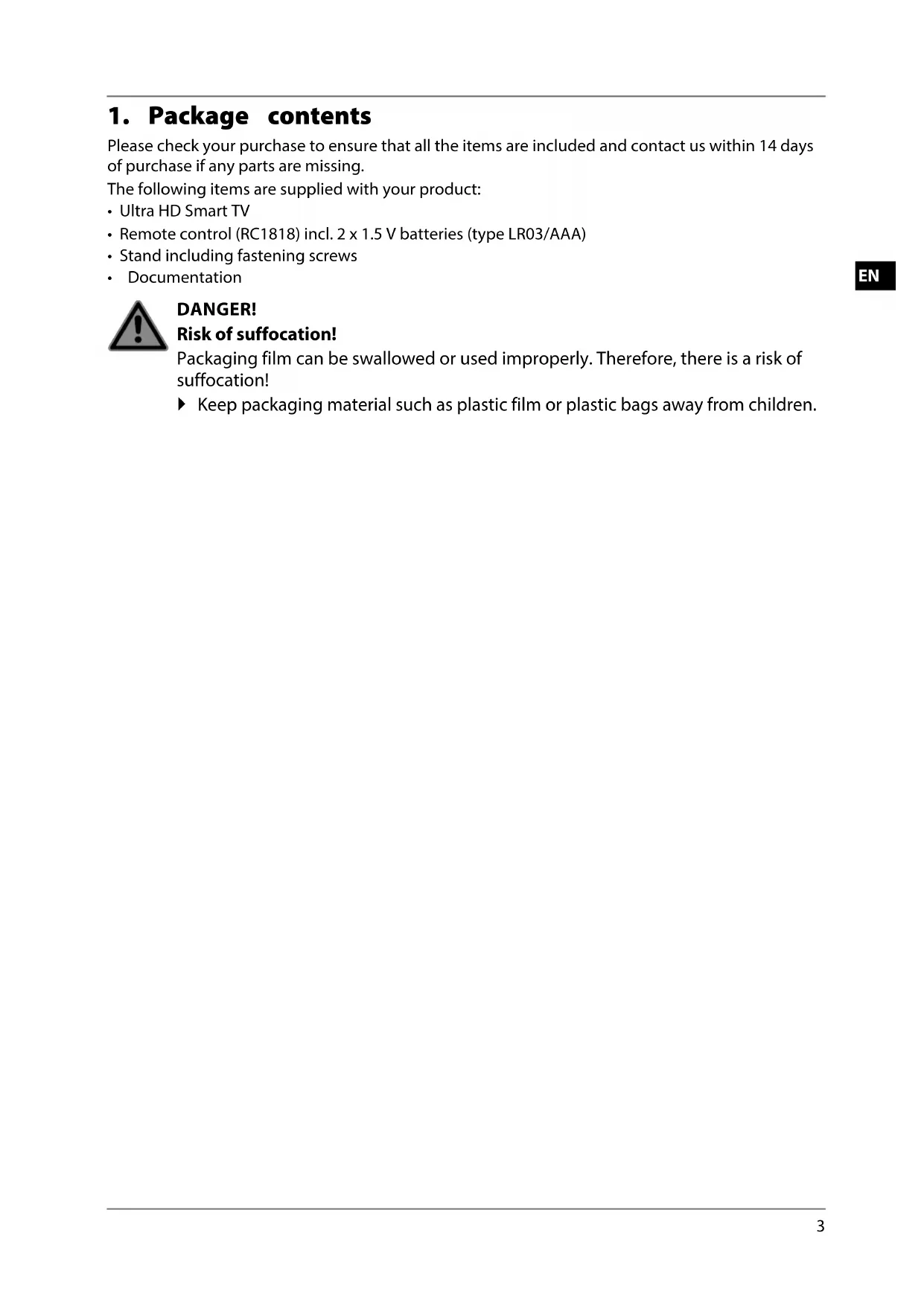 - Documentation DANGER! Risk of suffocation! Packaging film can be swallowed or used improperly. Therefore, there is a risk of suffocation! Keep packaging material such as plastic film or plastic bags away from children.
