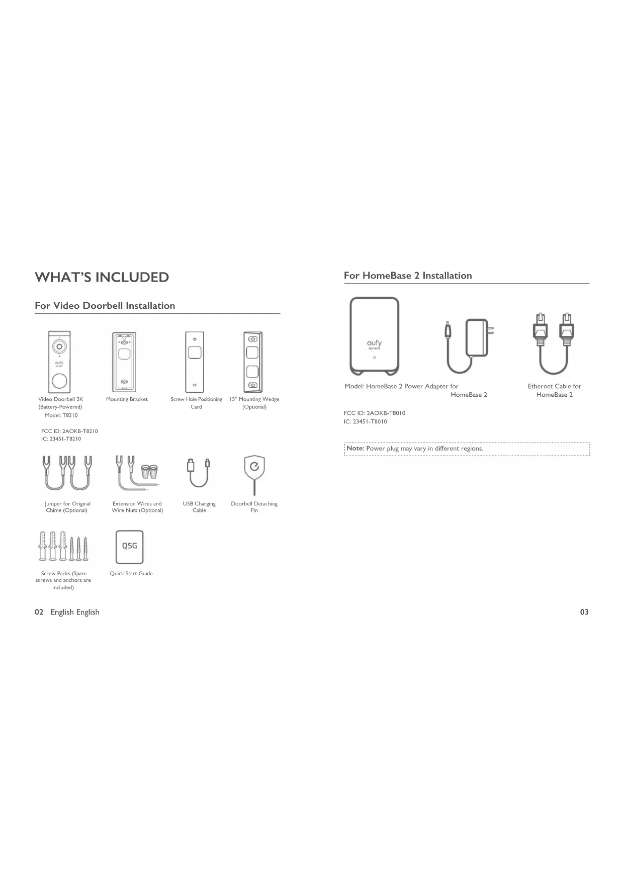 For Video Doorbell Installation QSG Video Doorbell 2K (Battery-Powered) Model: T8210Jumper for Original Chime (Optional)Screw Packs (Spare screws and anchors are included)Quick Start GuideScrew Hole Positioning Card Doorbell Detaching Pin 15° Mounting Wedge (Optional)Mounting Bracket Extension Wires and Wire Nuts (Optional) FCC ID: 2AOKB-T8210IC: 23451-T8210USB Charging Cable For HomeBase 2 Installation Model: HomeBase 2 Power Adapter for HomeBase 2 Ethernet Cable for HomeBase 2FCC ID: 2AOKB-T8010IC: 23451-T8010 Note: Power plug may vary in different regions.04 English English
