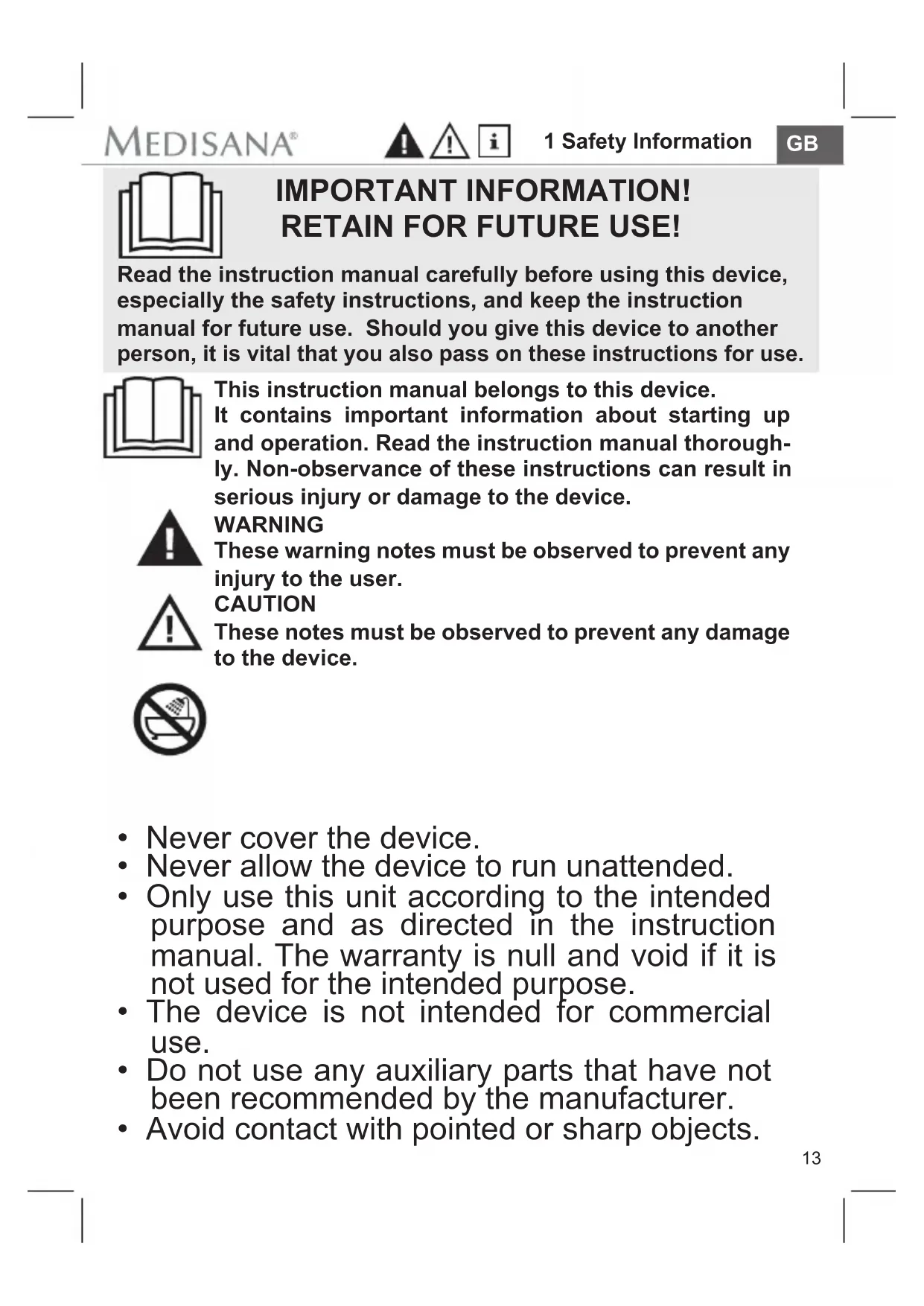 In accordance with our policy of continual product improve- ment, we reserve the right for technical and design changes without notice. Warranty and repair terms Please contact your supplier or the service centre in case of a claim under the war- ranty. If you have to return the unit, please enclose a copy of your receipt and state what the defect is. The following warranty terms apply: 1. The warranty period for MEDISANA products is three years from date of purchase. In case of a warranty claim, the date of purchase has to be proven by means of the sales re- ceipt or invoice. 2. Defects in material or workmanship will be corrected free of charge within the warranty period. 3. Repairs under warranty do not extend the warranty pe- riod either for the unit or for the replacement parts. 4. The following is excluded under the warranty: a. All damage which has arisen due to improper treatment, e.g. non- observance of the user instructions. b. All damage which is due to repairs or tamper- ing by the customer or unauthorised third parties. c. Damage which has arisen during transport from the manufacturer to the consumer or during transport to the service centre. d. Accessories which are subject to normal wear and tear. 5. Liability for direct or indirect consequential losses caused by the unit are excluded even if the damage to the unit is accepted as a warranty claim.19
