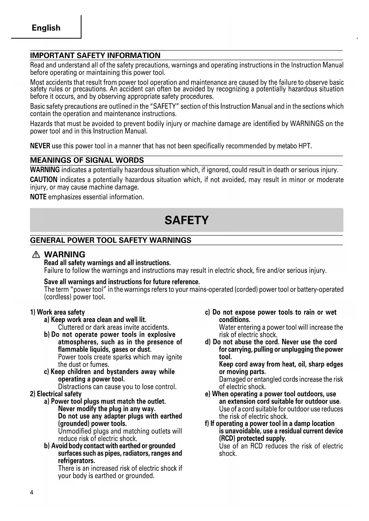 Read and understand all of the safety precautions, warnings and operating instructions in the Instruction Manual before operating or maintaining this power tool. Most accidents that result from power tool operation and maintenance are caused by the failure to observe basic safety rules or precautions. An accident can often be avoided by recognizing a potentially hazardous situation before it occurs, and by observing appropriate safety procedures. Basic safety precautions are outlined in the “SAFETY” section of this Instruction Manual and in the sections which contain the operation and maintenance instructions. Hazards that must be avoided to prevent bodily injury or machine damage are identified by WARNINGS on the power tool and in this Instruction Manual. NEVER use this power tool in a manner that has not been specifically recommended by metabo HPT.