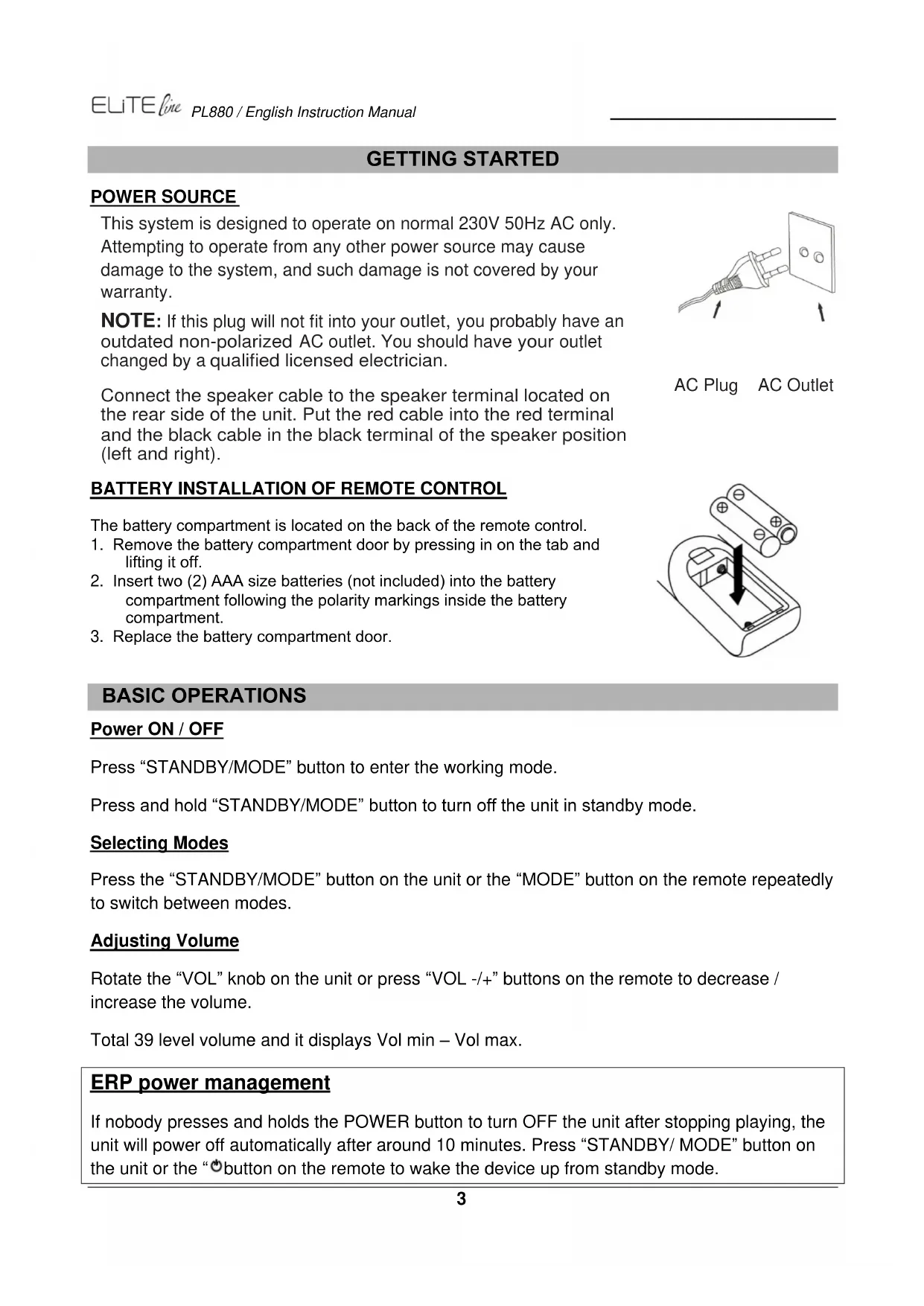 GETTING STARTED POWER SOURCE This system is designed to operate on normal 230V 50Hz AC only. Attempting to operate from any other power source may cause damage to the system, and such damage is not covered by your warranty. NOTE: If this plug will not fit into your outlet, you probably have an outdated non-polarized AC outlet. You should hav e your outlet changed by a qualified licensed electrician. Connect the speaker cable to the speaker terminal located on the rear side of the unit. Put the red cable into the red terminal and the black cable in the black terminal of the speaker position (left and right).
