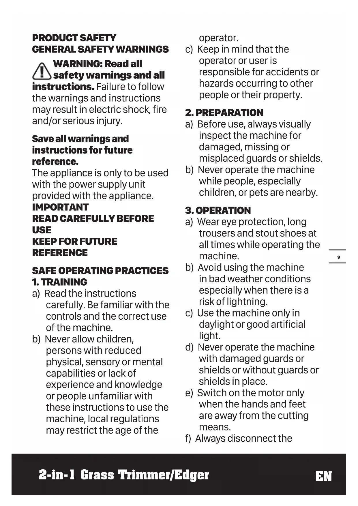 a) Wear eye protection, long trousers and stout shoes at all times while operating the machine. b) Avoid using the machine in bad weather conditions especially when there is a risk of lightning. c) Use the machine only in daylight or good artificial light. d) Never operate the machine with damaged guards or shields or without guards or shields in place. e) Switch on the motor only when the hands and feet are away from the cutting means. f) Always disconnect the2-in-1 Grass Trimmer/Edger