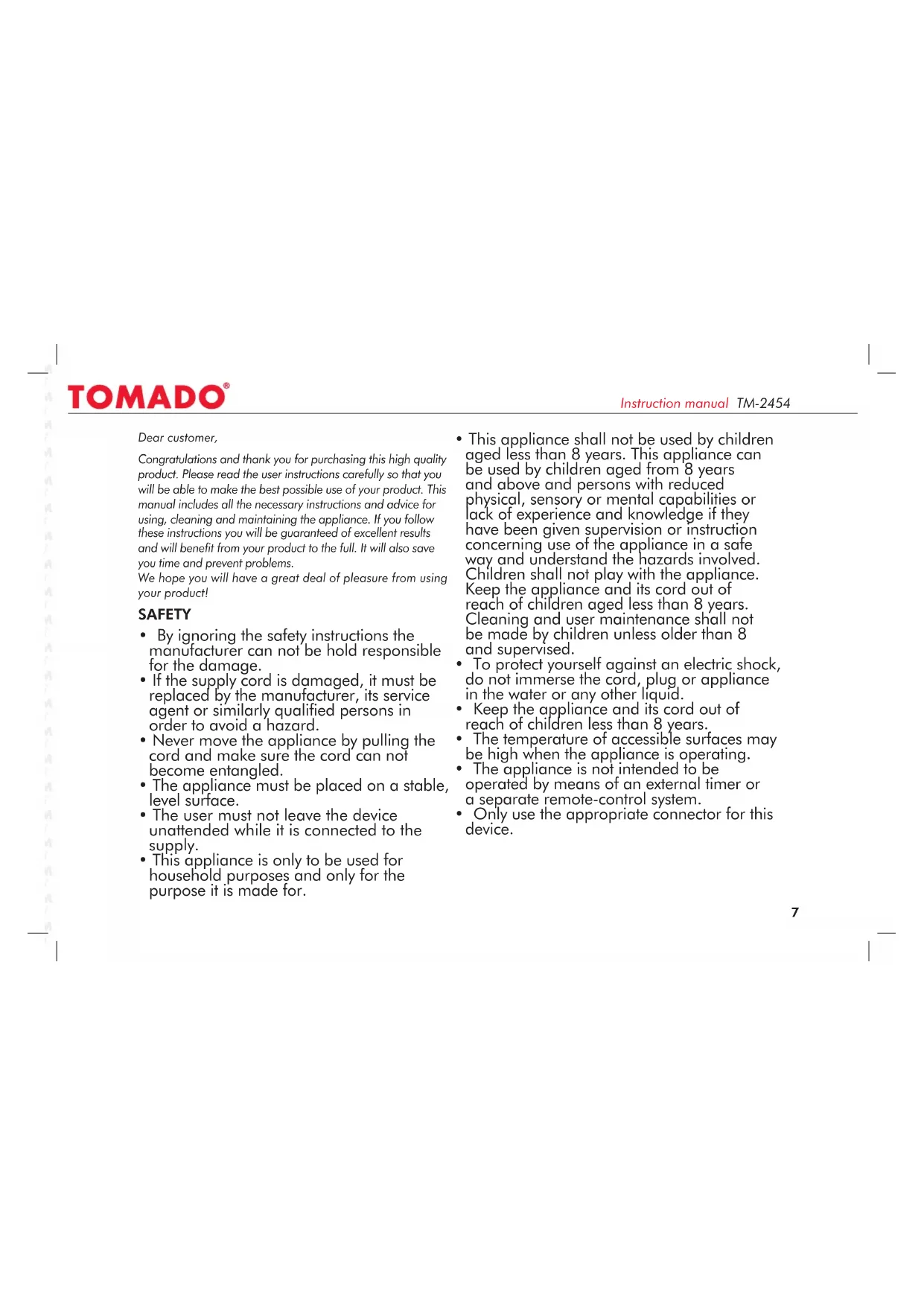 - Other warranty regulations than the warranty regulations stated above are not applicable. Service For more information you can write to the following address (postage paid): TOMADO Consumentenservice Antwoordnummer 19016 NL - 1000 VC Amsterdam The Netherlands What do you do in case your appliance does not work? When your appliance shows defects, you can refer to your salesperson. Your salesperson will make sure any defect will be repaired as soon as possible. Repairs outside the warranty period You can always hand in your appliance to have it repaired outside the warranty period. This will of course not be free of charge. We would like to congratulate you on buying an appliance from the TOMADO product range. Warranty regulations