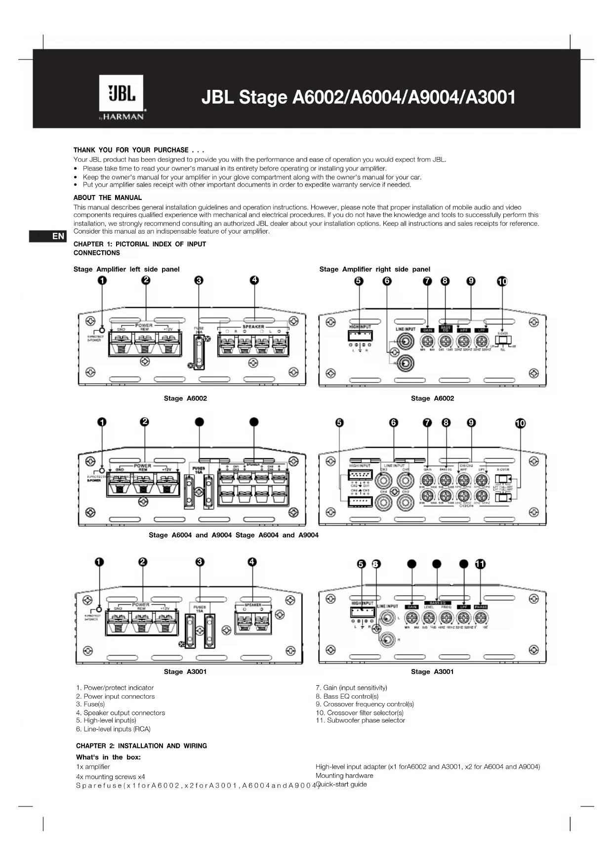 This manual describes general installation guidelines and operation instructions. However, please note that proper installation of mobile audio and video components requires qualified experience with mechanical and electrical procedures. If you do not have the knowledge and tools to successfully perform this installation, we strongly recommend consulting an authorized JBL dealer about your installation options. Keep all instructions and sales receipts for reference. Consider this manual as an indispensable feature of your amplifier. CHAPTER 1: PICTORIAL INDEX OF INPUTCONNECTIONSStage Amplifier left side panelStage A6002Stage A6004 and A9004 Stage A6004 and A9004Stage A3001Stage A6002Stage A30011. Power/protect indicator2. Power input connectors3. Fuse(s)4. Speaker output connectors5. High-level input(s)6. Line-level inputs (RCA)7. Gain (input sensitivity)8. Bass EQ control(s)9. Crossover frequency control(s)10. Crossover filter selector(s)11. Subwoofer phase selectorStage Amplifier right side panelCHAPTER 2: INSTALLATION AND WIRINGWhat's in the box:1x amplifier4x mounting screws x4Sparefuse(x1forA6002,x2forA3001,A6004andA9004) High-level input adapter (x1 forA6002 and A3001, x2 for A6004 and A9004) Mounting hardwareQuick-start guide