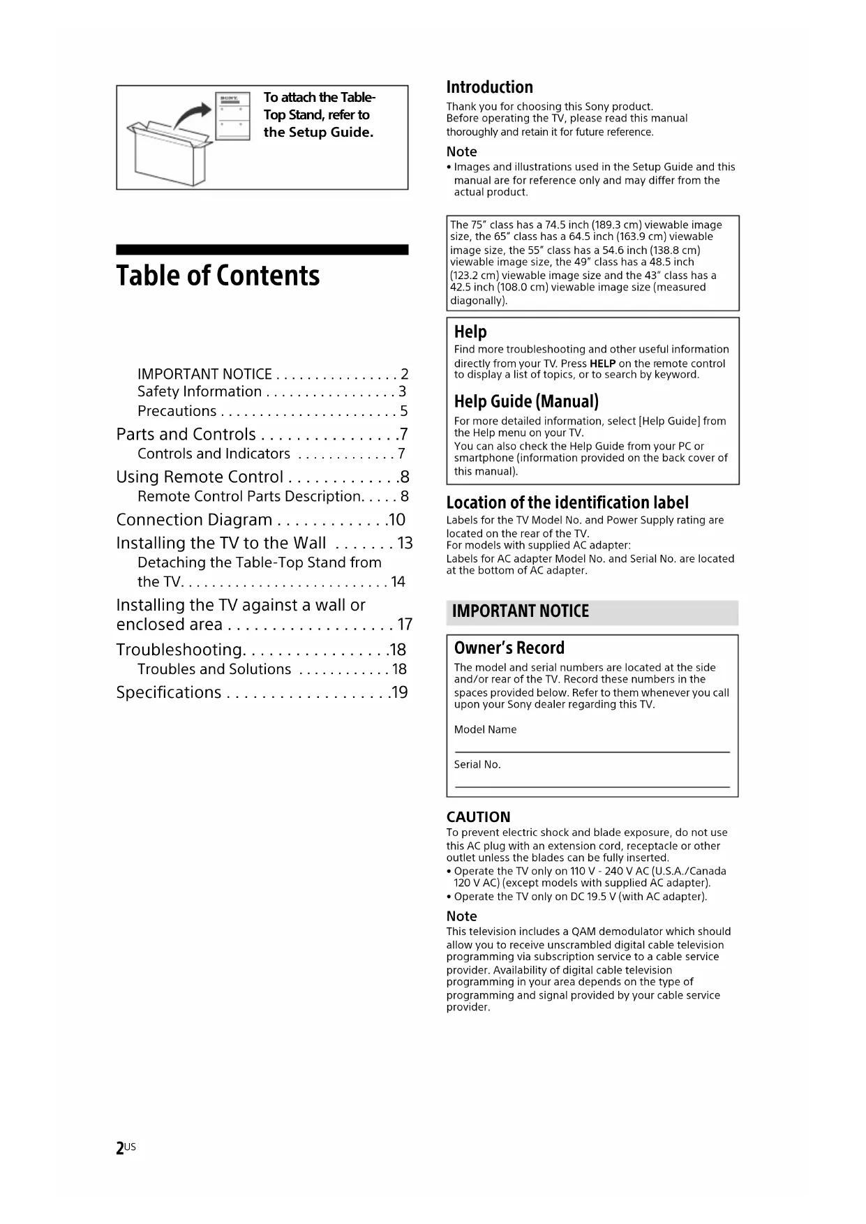 - Images and illustrations used in the Setup Guide and this manual are for reference only and may differ from the actual product. Location of the identification label Labels for the TV Model No. and Power Supply rating are located on the rear of the TV.For models with supplied AC adapter:Labels for AC adapter Model No. and Serial No. are located at the bottom of AC adapter. CAUTION To prevent electric shock and blade exposure, do not use this AC plug with an extension cord, receptacle or other outlet unless the blades can be fully inserted. • Operate the TV only on 110 V - 240 V AC (U.S.A./Canada 120 V AC) (except models with supplied AC adapter).• Operate the TV only on DC 19.5 V (with AC adapter). Note This television includes a QAM demodulator which should allow you to receive unscrambled digital cable television programming via subscription service to a cable service provider. Availability of digital cable television programming in your area depends on the type of programming and signal provided by your cable service provider. To attach the Table- Top Stand, refer to the Setup Guide. The 75” class has a 74.5 inch (189.3 cm) viewable image size, the 65” class has a 64.5 inch (163.9 cm) viewable image size, the 55” class has a 54.6 inch (138.8 cm) viewable image size, the 49” class has a 48.5 inch (123.2 cm) viewable image size and the 43” class has a 42.5 inch (108.0 cm) viewable image size (measured diagonally). Help Find more troubleshooting and other useful information directly from your TV. Press HELP on the remote control to display a list of topics, or to search by keyword. Help Guide (Manual) For more detailed information, select [Help Guide] from the Help menu on your TV. You can also check the Help Guide from your PC or smartphone (information provided on the back cover of this manual). IMPORTANT NOTICE Owner’s Record The model and serial numbers are located at the side and/or rear of the TV. Record these numbers in the spaces provided below. Refer to them whenever you call upon your Sony dealer regarding this TV.Model NameSerial No.3