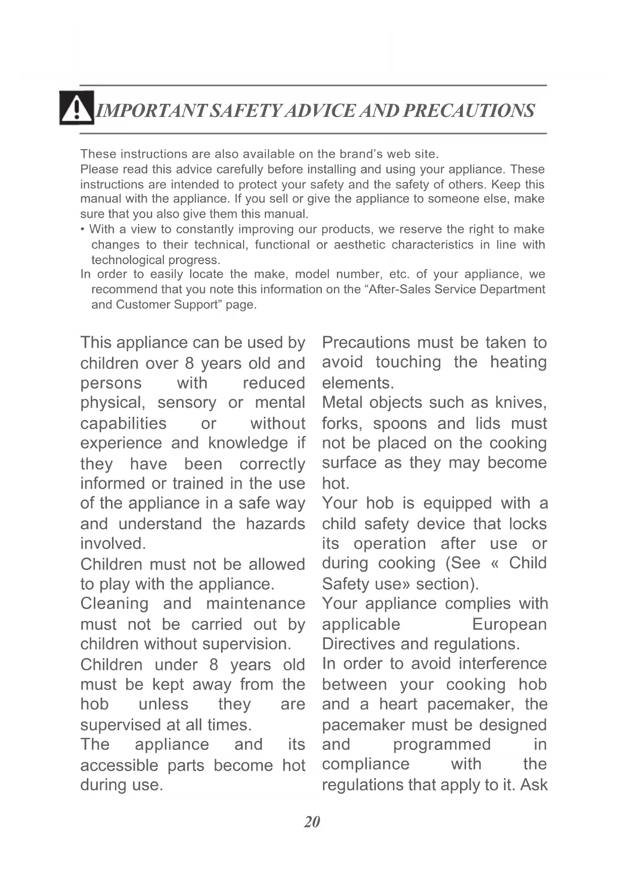 This appliance can be used by children over 8 years old and persons with reduced physical, sensory or mental capabilities or without experience and knowledge if they have been correctly informed or trained in the use of the appliance in a safe way and understand the hazards involved. Children must not be allowed to play with the appliance. Cleaning and maintenance must not be carried out by children without supervision. Children under 8 years old must be kept away from the hob unless they are supervised at all times. The appliance and its accessible parts become hot during use. Precautions must be taken to avoid touching the heating elements. Metal objects such as knives, forks, spoons and lids must not be placed on the cooking surface as they may become hot. Your hob is equipped with a child safety device that locks its operation after use or during cooking (See « Child Safety use» section). Your appliance complies with applicable European Directives and regulations. In order to avoid interference between your cooking hob and a heart pacemaker, the pacemaker must be designed and programmed in compliance with the regulations that apply to it. Ask21